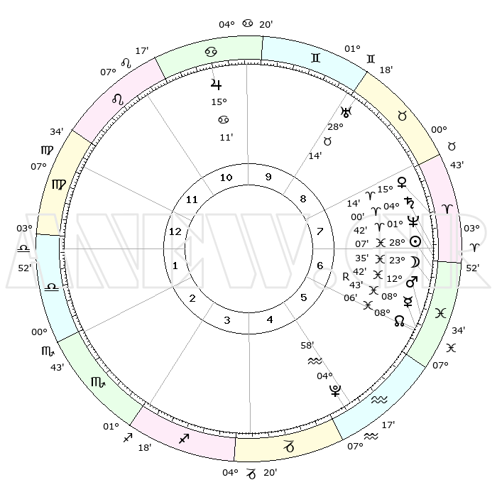 | | ΘΕΣΕΙΣ ΠΛΑΝΗΤΩΝ ΑΣΤΡΟΛΟΓΙΚΟΥ ΧΑΡΤΗ ΤΗΣ ΣΤΙΓΜΗΣ ΑΥΤΗΣ | | | | Πλανήτης | Ζώδιο | Μοίρες | Δεκαήμ. | Σε οίκο | Απόκλιση | | Ακμές των οίκων | | Ηλιος | Ιχθείς | 28°03' | Τρίτο | 7 | 00 S 47 | | 1ος | 15°02' | Παρθένος | | Σελήνη | Ιχθείς | 22°42' | Τρίτο | 7 | 01 S 45 | | 2ος | 10°23' | Ζυγός | | Ερμής | Ιχθείς | 08°44'R | Πρώτο | 6 | 06 S 53 | | 3ος | 10°09' | Σκορπιός | | Αφροδίτη | Κριός | 15°09' | Δεύτερο | 8 | 05 N 06 | | 4ος | 13°05' | Τοξότης | | Αρης | Ιχθείς | 12°39' | Δεύτερο | 6 | 07 S 49 | | 5ος | 16°27' | Αιγόκερως | | Δίας | Καρκίνος | 15°11' | Δεύτερο | 10 | 22 N 56 | | 6ος | 17°29' | Υδροχόος | | Κρόνος | Κριός | 03°60' | Πρώτο | 7 | 00 S 22 | | 7ος | 15°02' | Ιχθείς | | Ουρανός | Ταύρος | 28°14' | Τρίτο | 9 | 19 N 36 | | 8ος | 10°23' | Κριός | | Ποσειδώνας | Κριός | 01°42' | Πρώτο | 7 | 00 S 31 | | 9ος | 10°09' | Ταύρος | | Πλούτωνας | Υδροχόος | 04°58' | Πρώτο | 5 | 22 S 49 | | 10ος | 13°05' | Δίδυμοι | | Β. Δεσμός | Ιχθείς | 08°07' | Πρώτο | 6 | 08 S 32 | | 11ος | 16°27' | Καρκίνος | | Ωροσκόπος | Παρθένος | 15°02' | Δεύτερο | | | 12ος | 17°29' | Λέων | | Μεσουράνημα | Δίδυμοι | 13°05' | Δεύτερο | | | |
