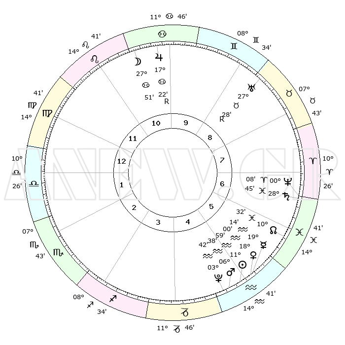 | | ΘΕΣΕΙΣ ΠΛΑΝΗΤΩΝ ΑΣΤΡΟΛΟΓΙΚΟΥ ΧΑΡΤΗ ΤΗΣ ΣΤΙΓΜΗΣ ΑΥΤΗΣ | | | | Πλανήτης | Ζώδιο | Μοίρες | Δεκαήμ. | Σε οίκο | Απόκλιση | | Ακμές των οίκων | | Ηλιος | Υδροχόος | 11°55' | Δεύτερο | 5 | 17 S 13 | | 1ος | 21°36' | Παρθένος | | Σελήνη | Καρκίνος | 26°55' | Τρίτο | 11 | 24 N 13 | | 2ος | 17°32' | Ζυγός | | Ερμής | Υδροχόος | 19°07' | Δεύτερο | 5 | 16 S 53 | | 3ος | 17°37' | Σκορπιός | | Αφροδίτη | Υδροχόος | 17°56' | Δεύτερο | 5 | 16 S 45 | | 4ος | 20°33' | Τοξότης | | Αρης | Υδροχόος | 06°34' | Πρώτο | 5 | 19 S 38 | | 5ος | 23°42' | Αιγόκερως | | Δίας | Καρκίνος | 17°23'R | Δεύτερο | 10 | 22 N 36 | | 6ος | 24°27' | Υδροχόος | | Κρόνος | Ιχθείς | 28°44' | Τρίτο | 7 | 02 S 30 | | 7ος | 21°36' | Ιχθείς | | Ουρανός | Ταύρος | 27°28'R | Τρίτο | 9 | 19 N 24 | | 8ος | 17°32' | Κριός | | Ποσειδώνας | Κριός | 00°08' | Πρώτο | 7 | 01 S 09 | | 9ος | 17°37' | Ταύρος | | Πλούτωνας | Υδροχόος | 03°42' | Πρώτο | 5 | 23 S 01 | | 10ος | 20°33' | Δίδυμοι | | Β. Δεσμός | Ιχθείς | 10°32' | Δεύτερο | 6 | 07 S 37 | | 11ος | 23°42' | Καρκίνος | | Ωροσκόπος | Παρθένος | 21°36' | Τρίτο | | | 12ος | 24°27' | Λέων | | Μεσουράνημα | Δίδυμοι | 20°33' | Τρίτο | | | |