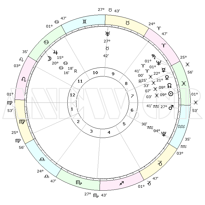 | | ΘΕΣΕΙΣ ΠΛΑΝΗΤΩΝ ΑΣΤΡΟΛΟΓΙΚΟΥ ΧΑΡΤΗ ΤΗΣ ΣΤΙΓΜΗΣ ΑΥΤΗΣ | | | | Πλανήτης | Ζώδιο | Μοίρες | Δεκαήμ. | Σε οίκο | Απόκλιση | | Ακμές των οίκων | | Ηλιος | Ιχθείς | 08°60' | Πρώτο | 8 | 08 S 12 | | 1ος | 14°34' | Λέων | | Σελήνη | Καρκίνος | 19°26' | Δεύτερο | 12 | 26 N 01 | | 2ος | 06°49' | Παρθένος | | Ερμής | Ιχθείς | 22°26'R | Τρίτο | 8 | 00 S 12 | | 3ος | 03°49' | Ζυγός | | Αφροδίτη | Ιχθείς | 21°28' | Τρίτο | 8 | 04 S 39 | | 4ος | 06°12' | Σκορπιός | | Αρης | Υδροχόος | 27°39' | Τρίτο | 7 | 13 S 19 | | 5ος | 11°31' | Τοξότης | | Δίας | Καρκίνος | 15°18'R | Δεύτερο | 12 | 22 N 54 | | 6ος | 15°03' | Αιγόκερως | | Κρόνος | Κριός | 01°40' | Πρώτο | 8 | 01 S 18 | | 7ος | 14°34' | Υδροχόος | | Ουρανός | Ταύρος | 27°42' | Τρίτο | 10 | 19 N 28 | | 8ος | 06°49' | Ιχθείς | | Ποσειδώνας | Κριός | 00°60' | Πρώτο | 8 | 00 S 48 | | 9ος | 03°49' | Κριός | | Πλούτωνας | Υδροχόος | 04°30' | Πρώτο | 6 | 22 S 53 | | 10ος | 06°12' | Ταύρος | | Β. Δεσμός | Ιχθείς | 09°07' | Πρώτο | 8 | 08 S 09 | | 11ος | 11°31' | Δίδυμοι | | Ωροσκόπος | Λέων | 14°34' | Δεύτερο | | | 12ος | 15°03' | Καρκίνος | | Μεσουράνημα | Ταύρος | 06°12' | Πρώτο | | | |