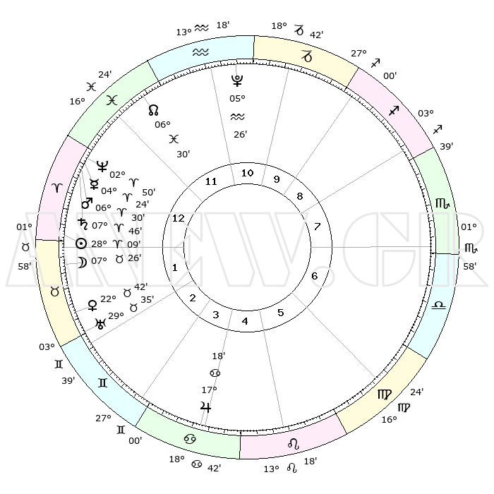 | | ΘΕΣΕΙΣ ΠΛΑΝΗΤΩΝ ΑΣΤΡΟΛΟΓΙΚΟΥ ΧΑΡΤΗ ΤΗΣ ΣΤΙΓΜΗΣ ΑΥΤΗΣ | | | | Πλανήτης | Ζώδιο | Μοίρες | Δεκαήμ. | Σε οίκο | Απόκλιση | | Ακμές των οίκων | | Ηλιος | Κριός | 28°01' | Τρίτο | 2 | 10 N 46 | | 1ος | 15°10' | Υδροχόος | | Σελήνη | Ταύρος | 05°24' | Πρώτο | 2 | 17 N 23 | | 2ος | 00°52' | Κριός | | Ερμής | Κριός | 04°12' | Πρώτο | 2 | 00 S 45 | | 3ος | 06°33' | Ταύρος | | Αφροδίτη | Ταύρος | 22°32' | Τρίτο | 3 | 18 N 42 | | 4ος | 02°41' | Δίδυμοι | | Αρης | Κριός | 06°23' | Πρώτο | 2 | 01 N 39 | | 5ος | 24°38' | Δίδυμοι | | Δίας | Καρκίνος | 17°17' | Δεύτερο | 6 | 22 N 42 | | 6ος | 16°53' | Καρκίνος | | Κρόνος | Κριός | 07°45' | Πρώτο | 2 | 01 N 06 | | 7ος | 15°10' | Λέων | | Ουρανός | Ταύρος | 29°35' | Τρίτο | 3 | 19 N 54 | | 8ος | 00°52' | Ζυγός | | Ποσειδώνας | Κριός | 02°50' | Πρώτο | 2 | 00 S 05 | | 9ος | 06°33' | Σκορπιός | | Πλούτωνας | Υδροχόος | 05°26' | Πρώτο | 12 | 22 S 47 | | 10ος | 02°41' | Τοξότης | | Β. Δεσμός | Ιχθείς | 06°30' | Πρώτο | 1 | 09 S 07 | | 11ος | 24°38' | Τοξότης | | Ωροσκόπος | Υδροχόος | 15°10' | Δεύτερο | | | 12ος | 16°53' | Αιγόκερως | | Μεσουράνημα | Τοξότης | 02°41' | Πρώτο | | | |
