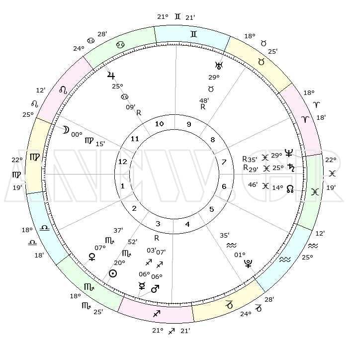 | | ΘΕΣΕΙΣ ΠΛΑΝΗΤΩΝ ΑΣΤΡΟΛΟΓΙΚΟΥ ΧΑΡΤΗ ΤΗΣ ΣΤΙΓΜΗΣ ΑΥΤΗΣ | | | | Πλανήτης | Ζώδιο | Μοίρες | Δεκαήμ. | Σε οίκο | Απόκλιση | | Ακμές των οίκων | | Ηλιος | Σκορπιός | 20°48' | Τρίτο | 3 | 17 S 57 | | 1ος | 02°09' | Παρθένος | | Σελήνη | Λέων | 29°22' | Τρίτο | 12 | 13 N 04 | | 2ος | 26°14' | Παρθένος | | Ερμής | Τοξότης | 06°05'R | Πρώτο | 4 | 23 S 03 | | 3ος | 25°05' | Ζυγός | | Αφροδίτη | Σκορπιός | 07°32' | Πρώτο | 3 | 12 S 50 | | 4ος | 28°02' | Σκορπιός | | Αρης | Τοξότης | 06°04' | Πρώτο | 4 | 21 S 49 | | 5ος | 02°04' | Αιγόκερως | | Δίας | Καρκίνος | 25°09'R | Τρίτο | 11 | 21 N 13 | | 6ος | 03°52' | Υδροχόος | | Κρόνος | Ιχθείς | 25°29'R | Τρίτο | 7 | 04 S 01 | | 7ος | 02°09' | Ιχθείς | | Ουρανός | Ταύρος | 29°48'R | Τρίτο | 10 | 19 N 54 | | 8ος | 26°14' | Ιχθείς | | Ποσειδώνας | Ιχθείς | 29°35'R | Τρίτο | 8 | 01 S 25 | | 9ος | 25°05' | Κριός | | Πλούτωνας | Υδροχόος | 01°35' | Πρώτο | 5 | 23 S 29 | | 10ος | 28°02' | Ταύρος | | Β. Δεσμός | Ιχθείς | 14°46' | Δεύτερο | 7 | 06 S 00 | | 11ος | 02°04' | Καρκίνος | | Ωροσκόπος | Παρθένος | 02°09' | Πρώτο | | | 12ος | 03°52' | Λέων | | Μεσουράνημα | Ταύρος | 28°02' | Τρίτο | | | |