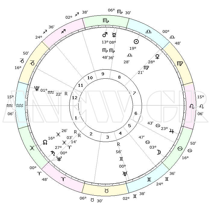 | ΘΕΣΕΙΣ ΠΛΑΝΗΤΩΝ ΑΣΤΡΟΛΟΓΙΚΟΥ ΧΑΡΤΗ ΤΗΣ ΣΤΙΓΜΗΣ ΑΥΤΗΣ | | Πλανήτης | Ζώδιο | Μοίρες | Δεκαήμ. | Σε οίκο | Απόκλιση | | Ακμές των οίκων | Ηλιος | Ζυγός | 19°22' | Δεύτερο | 9 | 07 S 35 | | 1ος | 07°03' | Αιγόκερως | Σελήνη | Καρκίνος | 02°28' | Πρώτο | 6 | 28 N 27 | | 2ος | 15°60' | Υδροχόος | Ερμής | Σκορπιός | 08°28' | Πρώτο | 10 | 15 S 42 | | 3ος | 26°18' | Ιχθείς | Αφροδίτη | Παρθένος | 28°14' | Τρίτο | 9 | 02 N 04 | | 4ος | 29°01' | Κριός | Αρης | Σκορπιός | 13°44' | Δεύτερο | 10 | 16 S 09 | | 5ος | 24°16' | Ταύρος | Δίας | Καρκίνος | 23°42' | Τρίτο | 7 | 21 N 24 | | 6ος | 15°42' | Δίδυμοι | Κρόνος | Ιχθείς | 27°03'R | Τρίτο | 3 | 03 S 28 | | 7ος | 07°03' | Καρκίνος | Ουρανός | Δίδυμοι | 00°56'R | Πρώτο | 5 | 20 N 08 | | 8ος | 15°60' | Λέων | Ποσειδώνας | Κριός | 00°14'R | Πρώτο | 3 | 01 S 10 | | 9ος | 26°18' | Παρθένος | Πλούτωνας | Υδροχόος | 01°22'R | Πρώτο | 1 | 23 S 32 | | 10ος | 29°01' | Ζυγός | Β. Δεσμός | Ιχθείς | 16°26' | Δεύτερο | 2 | 05 S 21 | | 11ος | 24°16' | Σκορπιός | Ωροσκόπος | Αιγόκερως | 07°03' | Πρώτο | | | 12ος | 15°42' | Τοξότης | Μεσουράνημα | Ζυγός | 29°01' | Τρίτο | | | |