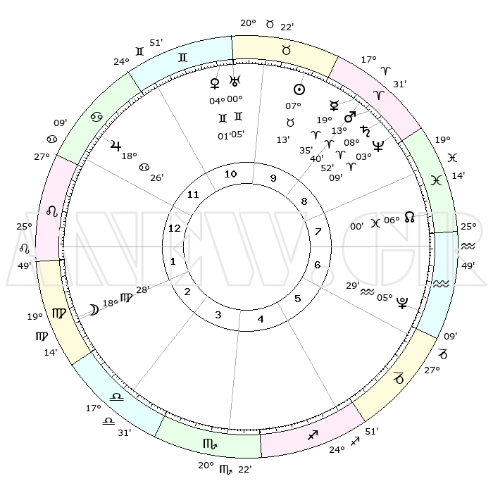 | | ΘΕΣΕΙΣ ΠΛΑΝΗΤΩΝ ΑΣΤΡΟΛΟΓΙΚΟΥ ΧΑΡΤΗ ΤΗΣ ΣΤΙΓΜΗΣ ΑΥΤΗΣ | | | | Πλανήτης | Ζώδιο | Μοίρες | Δεκαήμ. | Σε οίκο | Απόκλιση | | Ακμές των οίκων | | Ηλιος | Ταύρος | 07°09' | Πρώτο | 10 | 13 N 54 | | 1ος | 05°06' | Λέων | | Σελήνη | Παρθένος | 17°33' | Δεύτερο | 2 | 04 N 05 | | 2ος | 26°31' | Λέων | | Ερμής | Κριός | 19°27' | Δεύτερο | 9 | 05 N 31 | | 3ος | 22°15' | Παρθένος | | Αφροδίτη | Δίδυμοι | 03°56' | Πρώτο | 11 | 21 N 39 | | 4ος | 23°52' | Ζυγός | | Αρης | Κριός | 13°37' | Δεύτερο | 9 | 04 N 32 | | 5ος | 29°44' | Σκορπιός | | Δίας | Καρκίνος | 18°26' | Δεύτερο | 12 | 22 N 33 | | 6ος | 04°37' | Αιγόκερως | | Κρόνος | Κριός | 08°51' | Πρώτο | 9 | 01 N 31 | | 7ος | 05°06' | Υδροχόος | | Ουρανός | Δίδυμοι | 00°05' | Πρώτο | 11 | 20 N 00 | | 8ος | 26°31' | Υδροχόος | | Ποσειδώνας | Κριός | 03°09' | Πρώτο | 9 | 00 N 03 | | 9ος | 22°15' | Ιχθείς | | Πλούτωνας | Υδροχόος | 05°29' | Πρώτο | 7 | 22 S 48 | | 10ος | 23°52' | Κριός | | Β. Δεσμός | Ιχθείς | 06°00' | Πρώτο | 8 | 09 S 18 | | 11ος | 29°44' | Ταύρος | | Ωροσκόπος | Λέων | 05°06' | Πρώτο | | | 12ος | 04°37' | Καρκίνος | | Μεσουράνημα | Κριός | 23°52' | Τρίτο | | | |
