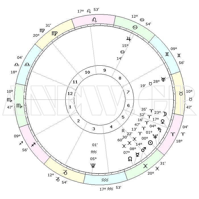| | ΘΕΣΕΙΣ ΠΛΑΝΗΤΩΝ ΑΣΤΡΟΛΟΓΙΚΟΥ ΧΑΡΤΗ ΤΗΣ ΣΤΙΓΜΗΣ ΑΥΤΗΣ | | | | Πλανήτης | Ζώδιο | Μοίρες | Δεκαήμ. | Σε οίκο | Απόκλιση | | Ακμές των οίκων | | Ηλιος | Κριός | 00°09' | Πρώτο | 6 | 00 N 03 | | 1ος | 18°33' | Ζυγός | | Σελήνη | Κριός | 22°29' | Τρίτο | 7 | 12 N 06 | | 2ος | 16°18' | Σκορπιός | | Ερμής | Ιχθείς | 08°30'R | Πρώτο | 5 | 07 S 27 | | 3ος | 17°31' | Τοξότης | | Αφροδίτη | Κριός | 17°46' | Δεύτερο | 6 | 06 N 10 | | 4ος | 21°02' | Αιγόκερως | | Αρης | Ιχθείς | 14°18' | Δεύτερο | 5 | 07 S 10 | | 5ος | 23°59' | Υδροχόος | | Δίας | Καρκίνος | 15°14' | Δεύτερο | 9 | 22 N 55 | | 6ος | 23°32' | Ιχθείς | | Κρόνος | Κριός | 04°16' | Πρώτο | 6 | 00 S 15 | | 7ος | 18°33' | Κριός | | Ουρανός | Ταύρος | 28°19' | Τρίτο | 8 | 19 N 37 | | 8ος | 16°18' | Ταύρος | | Ποσειδώνας | Κριός | 01°47' | Πρώτο | 6 | 00 S 29 | | 9ος | 17°31' | Δίδυμοι | | Πλούτωνας | Υδροχόος | 05°01' | Πρώτο | 4 | 22 S 49 | | 10ος | 21°02' | Καρκίνος | | Β. Δεσμός | Ιχθείς | 07°60' | Πρώτο | 5 | 08 S 34 | | 11ος | 23°59' | Λέων | | Ωροσκόπος | Ζυγός | 18°33' | Δεύτερο | | | 12ος | 23°32' | Παρθένος | | Μεσουράνημα | Καρκίνος | 21°02' | Τρίτο | | | |