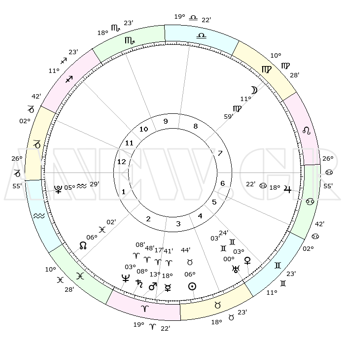 | | ΘΕΣΕΙΣ ΠΛΑΝΗΤΩΝ ΑΣΤΡΟΛΟΓΙΚΟΥ ΧΑΡΤΗ ΤΗΣ ΣΤΙΓΜΗΣ ΑΥΤΗΣ | | | | Πλανήτης | Ζώδιο | Μοίρες | Δεκαήμ. | Σε οίκο | Απόκλιση | | Ακμές των οίκων | | Ηλιος | Ταύρος | 06°41' | Πρώτο | 4 | 13 N 44 | | 1ος | 06°42' | Αιγόκερως | | Σελήνη | Παρθένος | 11°17' | Δεύτερο | 8 | 07 N 00 | | 2ος | 15°34' | Υδροχόος | | Ερμής | Κριός | 18°36' | Δεύτερο | 3 | 05 N 09 | | 3ος | 25°51' | Ιχθείς | | Αφροδίτη | Δίδυμοι | 03°21' | Πρώτο | 5 | 21 N 31 | | 4ος | 28°39' | Κριός | | Αρης | Κριός | 13°15' | Δεύτερο | 3 | 04 N 23 | | 5ος | 23°57' | Ταύρος | | Δίας | Καρκίνος | 18°22' | Δεύτερο | 7 | 22 N 33 | | 6ος | 15°23' | Δίδυμοι | | Κρόνος | Κριός | 08°48' | Πρώτο | 3 | 01 N 30 | | 7ος | 06°42' | Καρκίνος | | Ουρανός | Δίδυμοι | 00°03' | Πρώτο | 5 | 20 N 00 | | 8ος | 15°34' | Λέων | | Ποσειδώνας | Κριός | 03°08' | Πρώτο | 3 | 00 N 02 | | 9ος | 25°51' | Παρθένος | | Πλούτωνας | Υδροχόος | 05°29' | Πρώτο | 1 | 22 S 48 | | 10ος | 28°39' | Ζυγός | | Β. Δεσμός | Ιχθείς | 06°02' | Πρώτο | 2 | 09 S 18 | | 11ος | 23°57' | Σκορπιός | | Ωροσκόπος | Αιγόκερως | 06°42' | Πρώτο | | | 12ος | 15°23' | Τοξότης | | Μεσουράνημα | Ζυγός | 28°39' | Τρίτο | | | |