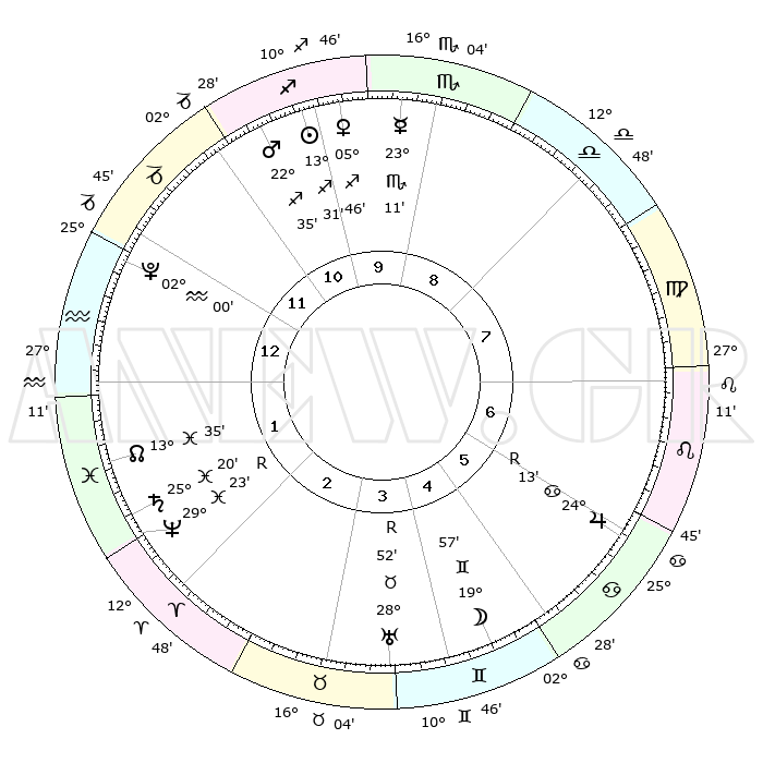 | | ΘΕΣΕΙΣ ΠΛΑΝΗΤΩΝ ΑΣΤΡΟΛΟΓΙΚΟΥ ΧΑΡΤΗ ΤΗΣ ΣΤΙΓΜΗΣ ΑΥΤΗΣ | | | | Πλανήτης | Ζώδιο | Μοίρες | Δεκαήμ. | Σε οίκο | Απόκλιση | | Ακμές των οίκων | | Ηλιος | Τοξότης | 13°29' | Δεύτερο | 10 | 22 S 25 | | 1ος | 10°54' | Υδροχόος | | Σελήνη | Δίδυμοι | 19°27' | Δεύτερο | 4 | 27 N 58 | | 2ος | 26°21' | Ιχθείς | | Ερμής | Σκορπιός | 23°10' | Τρίτο | 9 | 16 S 07 | | 3ος | 02°52' | Ταύρος | | Αφροδίτη | Τοξότης | 05°44' | Πρώτο | 10 | 20 S 43 | | 4ος | 29°35' | Ταύρος | | Αρης | Τοξότης | 22°34' | Τρίτο | 11 | 23 S 55 | | 5ος | 21°43' | Δίδυμοι | | Δίας | Καρκίνος | 24°14'R | Τρίτο | 6 | 21 N 26 | | 6ος | 13°40' | Καρκίνος | | Κρόνος | Ιχθείς | 25°20' | Τρίτο | 1 | 04 S 01 | | 7ος | 10°54' | Λέων | | Ουρανός | Ταύρος | 28°52'R | Τρίτο | 3 | 19 N 42 | | 8ος | 26°21' | Παρθένος | | Ποσειδώνας | Ιχθείς | 29°23'R | Τρίτο | 2 | 01 S 29 | | 9ος | 02°52' | Σκορπιός | | Πλούτωνας | Υδροχόος | 02°00' | Πρώτο | 12 | 23 S 23 | | 10ος | 29°35' | Σκορπιός | | Β. Δεσμός | Ιχθείς | 13°35' | Δεύτερο | 1 | 06 S 27 | | 11ος | 21°43' | Τοξότης | | Ωροσκόπος | Υδροχόος | 10°54' | Δεύτερο | | | 12ος | 13°40' | Αιγόκερως | | Μεσουράνημα | Σκορπιός | 29°35' | Τρίτο | | | |