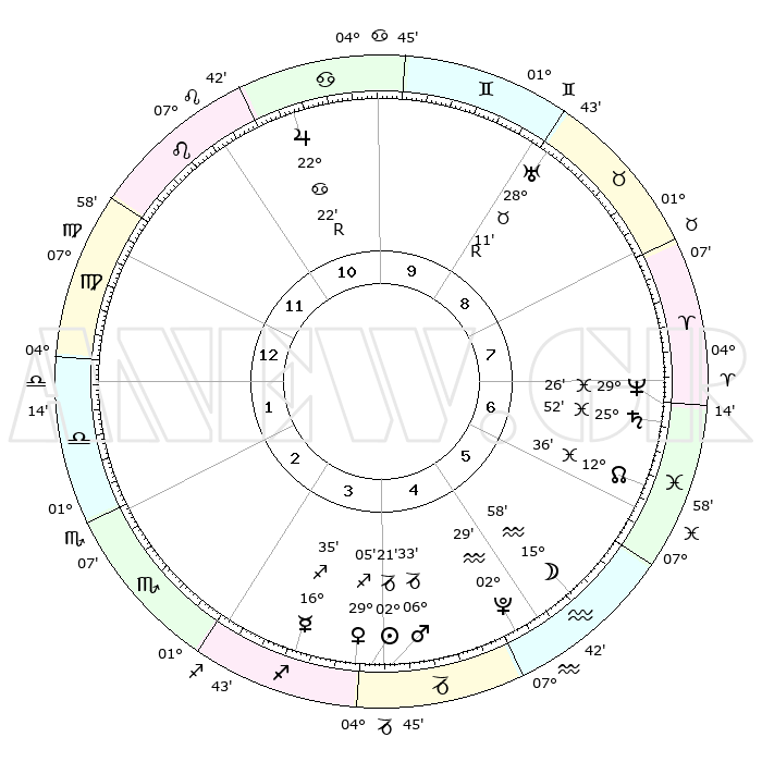 | | ΘΕΣΕΙΣ ΠΛΑΝΗΤΩΝ ΑΣΤΡΟΛΟΓΙΚΟΥ ΧΑΡΤΗ ΤΗΣ ΣΤΙΓΜΗΣ ΑΥΤΗΣ | | | | Πλανήτης | Ζώδιο | Μοίρες | Δεκαήμ. | Σε οίκο | Απόκλιση | | Ακμές των οίκων | | Ηλιος | Αιγόκερως | 02°17' | Πρώτο | 4 | 23 S 25 | | 1ος | 11°32' | Παρθένος | | Σελήνη | Υδροχόος | 14°60' | Δεύτερο | 6 | 18 S 29 | | 2ος | 06°33' | Ζυγός | | Ερμής | Τοξότης | 16°28' | Δεύτερο | 4 | 22 S 21 | | 3ος | 06°06' | Σκορπιός | | Αφροδίτη | Τοξότης | 28°59' | Τρίτο | 4 | 23 S 37 | | 4ος | 09°03' | Τοξότης | | Αρης | Αιγόκερως | 06°29' | Πρώτο | 4 | 24 S 07 | | 5ος | 12°34' | Αιγόκερως | | Δίας | Καρκίνος | 22°23'R | Τρίτο | 11 | 21 N 47 | | 6ος | 13°47' | Υδροχόος | | Κρόνος | Ιχθείς | 25°52' | Τρίτο | 7 | 03 S 45 | | 7ος | 11°32' | Ιχθείς | | Ουρανός | Ταύρος | 28°11'R | Τρίτο | 9 | 19 N 33 | | 8ος | 06°33' | Κριός | | Ποσειδώνας | Ιχθείς | 29°26' | Τρίτο | 7 | 01 S 27 | | 9ος | 06°06' | Ταύρος | | Πλούτωνας | Υδροχόος | 02°29' | Πρώτο | 5 | 23 S 16 | | 10ος | 09°03' | Δίδυμοι | | Β. Δεσμός | Ιχθείς | 12°36' | Δεύτερο | 7 | 06 S 50 | | 11ος | 12°34' | Καρκίνος | | Ωροσκόπος | Παρθένος | 11°32' | Δεύτερο | | | 12ος | 13°47' | Λέων | | Μεσουράνημα | Δίδυμοι | 09°03' | Πρώτο | | | |