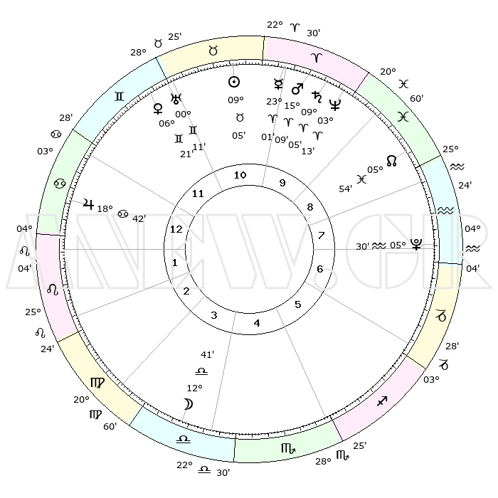 | | ΘΕΣΕΙΣ ΠΛΑΝΗΤΩΝ ΑΣΤΡΟΛΟΓΙΚΟΥ ΧΑΡΤΗ ΤΗΣ ΣΤΙΓΜΗΣ ΑΥΤΗΣ | | | | Πλανήτης | Ζώδιο | Μοίρες | Δεκαήμ. | Σε οίκο | Απόκλιση | | Ακμές των οίκων | | Ηλιος | Ταύρος | 09°03' | Πρώτο | 10 | 14 N 30 | | 1ος | 21°37' | Καρκίνος | | Σελήνη | Ζυγός | 12°09' | Δεύτερο | 4 | 07 S 29 | | 2ος | 12°12' | Λέων | | Ερμής | Κριός | 22°56' | Τρίτο | 10 | 06 N 58 | | 3ος | 06°09' | Παρθένος | | Αφροδίτη | Δίδυμοι | 06°18' | Πρώτο | 11 | 22 N 10 | | 4ος | 06°01' | Ζυγός | | Αρης | Κριός | 15°07' | Δεύτερο | 10 | 05 N 07 | | 5ος | 12°03' | Σκορπιός | | Δίας | Καρκίνος | 18°41' | Δεύτερο | 12 | 22 N 31 | | 6ος | 19°10' | Τοξότης | | Κρόνος | Κριός | 09°04' | Πρώτο | 10 | 01 N 36 | | 7ος | 21°37' | Αιγόκερως | | Ουρανός | Δίδυμοι | 00°11' | Πρώτο | 11 | 20 N 01 | | 8ος | 12°12' | Υδροχόος | | Ποσειδώνας | Κριός | 03°13' | Πρώτο | 9 | 00 N 04 | | 9ος | 06°09' | Ιχθείς | | Πλούτωνας | Υδροχόος | 05°30' | Πρώτο | 7 | 22 S 49 | | 10ος | 06°01' | Κριός | | Β. Δεσμός | Ιχθείς | 05°54' | Πρώτο | 8 | 09 S 21 | | 11ος | 12°03' | Ταύρος | | Ωροσκόπος | Καρκίνος | 21°37' | Τρίτο | | | 12ος | 19°10' | Δίδυμοι | | Μεσουράνημα | Κριός | 06°01' | Πρώτο | | | |