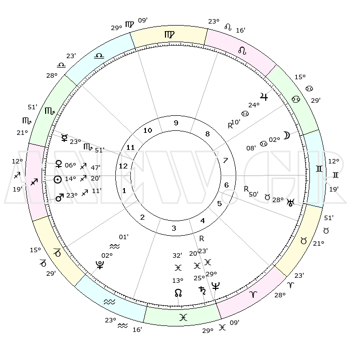 | | ΘΕΣΕΙΣ ΠΛΑΝΗΤΩΝ ΑΣΤΡΟΛΟΓΙΚΟΥ ΧΑΡΤΗ ΤΗΣ ΣΤΙΓΜΗΣ ΑΥΤΗΣ | | | | Πλανήτης | Ζώδιο | Μοίρες | Δεκαήμ. | Σε οίκο | Απόκλιση | | Ακμές των οίκων | | Ηλιος | Τοξότης | 14°18' | Δεύτερο | 1 | 22 S 31 | | 1ος | 02°24' | Τοξότης | | Σελήνη | Καρκίνος | 01°38' | Πρώτο | 7 | 28 N 11 | | 2ος | 03°53' | Αιγόκερως | | Ερμής | Σκορπιός | 23°50' | Τρίτο | 12 | 16 S 20 | | 3ος | 09°59' | Υδροχόος | | Αφροδίτη | Τοξότης | 06°44' | Πρώτο | 1 | 20 S 56 | | 4ος | 16°04' | Ιχθείς | | Αρης | Τοξότης | 23°10' | Τρίτο | 1 | 23 S 58 | | 5ος | 16°48' | Κριός | | Δίας | Καρκίνος | 24°10'R | Τρίτο | 8 | 21 N 27 | | 6ος | 11°31' | Ταύρος | | Κρόνος | Ιχθείς | 25°20' | Τρίτο | 4 | 04 S 01 | | 7ος | 02°24' | Δίδυμοι | | Ουρανός | Ταύρος | 28°50'R | Τρίτο | 6 | 19 N 42 | | 8ος | 03°53' | Καρκίνος | | Ποσειδώνας | Ιχθείς | 29°23'R | Τρίτο | 4 | 01 S 29 | | 9ος | 09°59' | Λέων | | Πλούτωνας | Υδροχόος | 02°01' | Πρώτο | 2 | 23 S 22 | | 10ος | 16°04' | Παρθένος | | Β. Δεσμός | Ιχθείς | 13°32' | Δεύτερο | 3 | 06 S 28 | | 11ος | 16°48' | Ζυγός | | Ωροσκόπος | Τοξότης | 02°24' | Πρώτο | | | 12ος | 11°31' | Σκορπιός | | Μεσουράνημα | Παρθένος | 16°04' | Δεύτερο | | | |