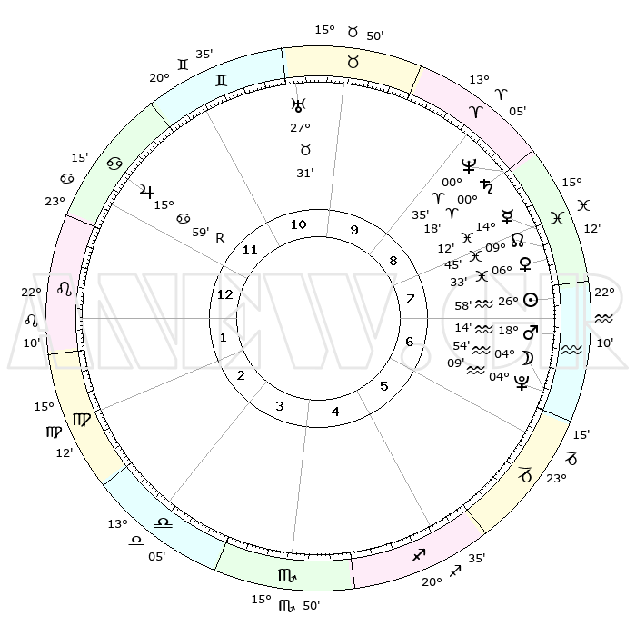 | | ΘΕΣΕΙΣ ΠΛΑΝΗΤΩΝ ΑΣΤΡΟΛΟΓΙΚΟΥ ΧΑΡΤΗ ΤΗΣ ΣΤΙΓΜΗΣ ΑΥΤΗΣ | | | | Πλανήτης | Ζώδιο | Μοίρες | Δεκαήμ. | Σε οίκο | Απόκλιση | | Ακμές των οίκων | | Ηλιος | Υδροχόος | 26°54' | Τρίτο | 8 | 12 S 32 | | 1ος | 04°40' | Λέων | | Σελήνη | Υδροχόος | 04°08' | Πρώτο | 6 | 22 S 09 | | 2ος | 26°03' | Λέων | | Ερμής | Ιχθείς | 14°07' | Δεύτερο | 8 | 06 S 05 | | 3ος | 21°44' | Παρθένος | | Αφροδίτη | Ιχθείς | 06°28' | Πρώτο | 8 | 10 S 30 | | 4ος | 23°18' | Ζυγός | | Αρης | Υδροχόος | 18°11' | Δεύτερο | 7 | 16 S 24 | | 5ος | 29°11' | Σκορπιός | | Δίας | Καρκίνος | 15°59'R | Δεύτερο | 12 | 22 N 48 | | 6ος | 04°08' | Αιγόκερως | | Κρόνος | Κριός | 00°17' | Πρώτο | 9 | 01 S 51 | | 7ος | 04°40' | Υδροχόος | | Ουρανός | Ταύρος | 27°31' | Τρίτο | 10 | 19 N 25 | | 8ος | 26°03' | Υδροχόος | | Ποσειδώνας | Κριός | 00°35' | Πρώτο | 9 | 00 S 58 | | 9ος | 21°44' | Ιχθείς | | Πλούτωνας | Υδροχόος | 04°09' | Πρώτο | 6 | 22 S 56 | | 10ος | 23°18' | Κριός | | Β. Δεσμός | Ιχθείς | 09°45' | Πρώτο | 8 | 07 S 55 | | 11ος | 29°11' | Ταύρος | | Ωροσκόπος | Λέων | 04°40' | Πρώτο | | | 12ος | 04°08' | Καρκίνος | | Μεσουράνημα | Κριός | 23°18' | Τρίτο | | | |