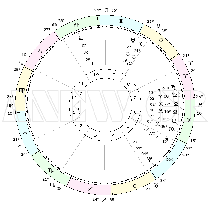| | ΘΕΣΕΙΣ ΠΛΑΝΗΤΩΝ ΑΣΤΡΟΛΟΓΙΚΟΥ ΧΑΡΤΗ ΤΗΣ ΣΤΙΓΜΗΣ ΑΥΤΗΣ | | | | Πλανήτης | Ζώδιο | Μοίρες | Δεκαήμ. | Σε οίκο | Απόκλιση | | Ακμές των οίκων | | Ηλιος | Ιχθείς | 05°03' | Πρώτο | 7 | 09 S 39 | | 1ος | 03°34' | Παρθένος | | Σελήνη | Ταύρος | 23°49' | Τρίτο | 9 | 23 N 39 | | 2ος | 27°47' | Παρθένος | | Ερμής | Ιχθείς | 22°00' | Τρίτο | 7 | 01 S 10 | | 3ος | 26°46' | Ζυγός | | Αφροδίτη | Ιχθείς | 16°34' | Δεύτερο | 7 | 06 S 37 | | 4ος | 29°43' | Σκορπιός | | Αρης | Υδροχόος | 24°33' | Τρίτο | 6 | 14 S 22 | | 5ος | 03°40' | Αιγόκερως | | Δίας | Καρκίνος | 15°28'R | Δεύτερο | 11 | 22 N 52 | | 6ος | 05°22' | Υδροχόος | | Κρόνος | Κριός | 01°13' | Πρώτο | 8 | 01 S 29 | | 7ος | 03°34' | Ιχθείς | | Ουρανός | Ταύρος | 27°38' | Τρίτο | 9 | 19 N 27 | | 8ος | 27°47' | Ιχθείς | | Ποσειδώνας | Κριός | 00°52' | Πρώτο | 8 | 00 S 51 | | 9ος | 26°46' | Κριός | | Πλούτωνας | Υδροχόος | 04°23' | Πρώτο | 5 | 22 S 54 | | 10ος | 29°43' | Ταύρος | | Β. Δεσμός | Ιχθείς | 09°20' | Πρώτο | 7 | 08 S 04 | | 11ος | 03°40' | Καρκίνος | | Ωροσκόπος | Παρθένος | 03°34' | Πρώτο | | | 12ος | 05°22' | Λέων | | Μεσουράνημα | Ταύρος | 29°43' | Τρίτο | | | |