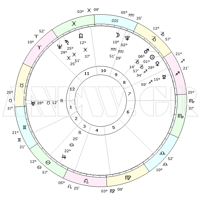 | | ΘΕΣΕΙΣ ΠΛΑΝΗΤΩΝ ΑΣΤΡΟΛΟΓΙΚΟΥ ΧΑΡΤΗ ΤΗΣ ΣΤΙΓΜΗΣ ΑΥΤΗΣ | | | | Πλανήτης | Ζώδιο | Μοίρες | Δεκαήμ. | Σε οίκο | Απόκλιση | | Ακμές των οίκων | | Ηλιος | Αιγόκερως | 01°51' | Πρώτο | 9 | 23 S 25 | | 1ος | 10°30' | Κριός | | Σελήνη | Υδροχόος | 09°45' | Πρώτο | 11 | 20 S 21 | | 2ος | 18°06' | Ταύρος | | Ερμής | Τοξότης | 15°51' | Δεύτερο | 9 | 22 S 14 | | 3ος | 13°59' | Δίδυμοι | | Αφροδίτη | Τοξότης | 28°27' | Τρίτο | 9 | 23 S 36 | | 4ος | 05°55' | Καρκίνος | | Αρης | Αιγόκερως | 06°10' | Πρώτο | 10 | 24 S 07 | | 5ος | 28°46' | Καρκίνος | | Δίας | Καρκίνος | 22°26'R | Τρίτο | 4 | 21 N 47 | | 6ος | 27°52' | Λέων | | Κρόνος | Ιχθείς | 25°51' | Τρίτο | 12 | 03 S 45 | | 7ος | 10°30' | Ζυγός | | Ουρανός | Ταύρος | 28°12'R | Τρίτο | 2 | 19 N 34 | | 8ος | 18°06' | Σκορπιός | | Ποσειδώνας | Ιχθείς | 29°25' | Τρίτο | 12 | 01 S 27 | | 9ος | 13°59' | Τοξότης | | Πλούτωνας | Υδροχόος | 02°28' | Πρώτο | 11 | 23 S 16 | | 10ος | 05°55' | Αιγόκερως | | Β. Δεσμός | Ιχθείς | 12°37' | Δεύτερο | 12 | 06 S 49 | | 11ος | 28°46' | Αιγόκερως | | Ωροσκόπος | Κριός | 10°30' | Δεύτερο | | | 12ος | 27°52' | Υδροχόος | | Μεσουράνημα | Αιγόκερως | 05°55' | Πρώτο | | | |