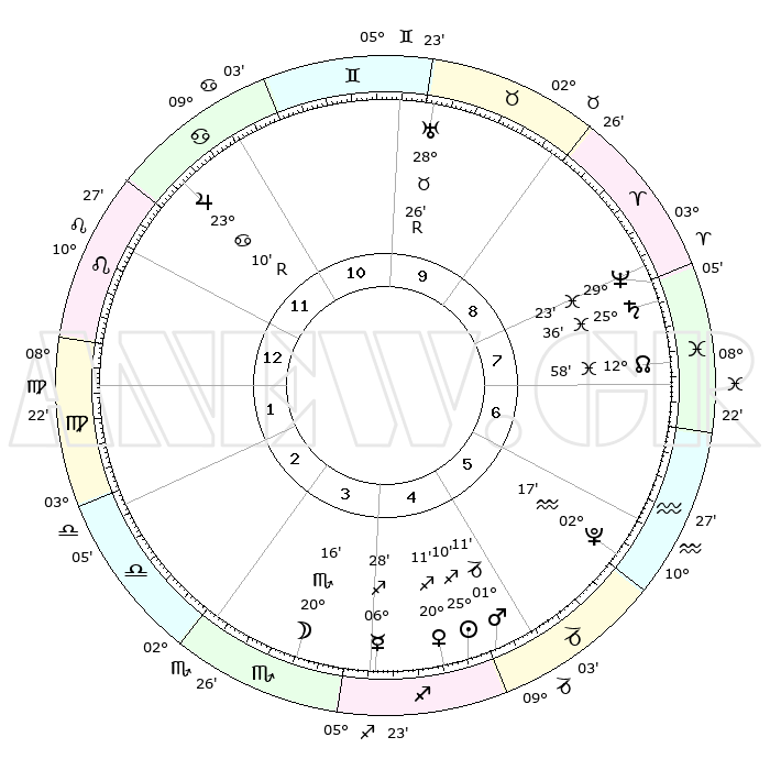 | | ΘΕΣΕΙΣ ΠΛΑΝΗΤΩΝ ΑΣΤΡΟΛΟΓΙΚΟΥ ΧΑΡΤΗ ΤΗΣ ΣΤΙΓΜΗΣ ΑΥΤΗΣ | | | | Πλανήτης | Ζώδιο | Μοίρες | Δεκαήμ. | Σε οίκο | Απόκλιση | | Ακμές των οίκων | | Ηλιος | Τοξότης | 24°49' | Τρίτο | 8 | 23 S 20 | | 1ος | 20°06' | Ταύρος | | Σελήνη | Σκορπιός | 16°20' | Δεύτερο | 6 | 21 S 01 | | 2ος | 17°05' | Δίδυμοι | | Ερμής | Τοξότης | 06°01' | Πρώτο | 7 | 19 S 59 | | 3ος | 08°59' | Καρκίνος | | Αφροδίτη | Τοξότης | 19°46' | Δεύτερο | 8 | 22 S 56 | | 4ος | 01°09' | Λέων | | Αρης | Αιγόκερως | 00°56' | Πρώτο | 8 | 24 S 13 | | 5ος | 28°02' | Λέων | | Δίας | Καρκίνος | 23°12'R | Τρίτο | 3 | 21 N 38 | | 6ος | 04°44' | Ζυγός | | Κρόνος | Ιχθείς | 25°35' | Τρίτο | 11 | 03 S 53 | | 7ος | 20°06' | Σκορπιός | | Ουρανός | Ταύρος | 28°26'R | Τρίτο | 1 | 19 N 37 | | 8ος | 17°05' | Τοξότης | | Ποσειδώνας | Ιχθείς | 29°23' | Τρίτο | 11 | 01 S 29 | | 9ος | 08°59' | Αιγόκερως | | Πλούτωνας | Υδροχόος | 02°17' | Πρώτο | 10 | 23 S 19 | | 10ος | 01°09' | Υδροχόος | | Β. Δεσμός | Ιχθείς | 12°59' | Δεύτερο | 11 | 06 S 41 | | 11ος | 28°02' | Υδροχόος | | Ωροσκόπος | Ταύρος | 20°06' | Τρίτο | | | 12ος | 04°44' | Κριός | | Μεσουράνημα | Υδροχόος | 01°09' | Πρώτο | | | |