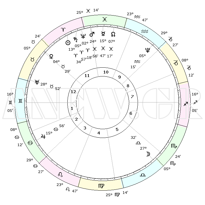| | ΘΕΣΕΙΣ ΠΛΑΝΗΤΩΝ ΑΣΤΡΟΛΟΓΙΚΟΥ ΧΑΡΤΗ ΤΗΣ ΣΤΙΓΜΗΣ ΑΥΤΗΣ | | | | Πλανήτης | Ζώδιο | Μοίρες | Δεκαήμ. | Σε οίκο | Απόκλιση | | Ακμές των οίκων | | Ηλιος | Κριός | 13°30' | Δεύτερο | 12 | 05 N 20 | | 1ος | 21°16' | Ταύρος | | Σελήνη | Ζυγός | 26°48' | Τρίτο | 6 | 13 S 55 | | 2ος | 17°59' | Δίδυμοι | | Ερμής | Ιχθείς | 15°44' | Δεύτερο | 11 | 07 S 08 | | 3ος | 09°49' | Καρκίνος | | Αφροδίτη | Ταύρος | 04°25' | Πρώτο | 12 | 12 N 40 | | 4ος | 02°02' | Λέων | | Αρης | Ιχθείς | 24°53' | Τρίτο | 11 | 02 S 59 | | 5ος | 29°05' | Λέων | | Δίας | Καρκίνος | 15°56' | Δεύτερο | 3 | 22 N 51 | | 6ος | 06°01' | Ζυγός | | Κρόνος | Κριός | 05°56' | Πρώτο | 11 | 00 N 24 | | 7ος | 21°16' | Σκορπιός | | Ουρανός | Ταύρος | 28°52' | Τρίτο | 1 | 19 N 44 | | 8ος | 17°59' | Τοξότης | | Ποσειδώνας | Κριός | 02°18' | Πρώτο | 11 | 00 S 17 | | 9ος | 09°49' | Αιγόκερως | | Πλούτωνας | Υδροχόος | 05°15' | Πρώτο | 10 | 22 S 47 | | 10ος | 02°02' | Υδροχόος | | Β. Δεσμός | Ιχθείς | 07°17' | Πρώτο | 11 | 08 S 50 | | 11ος | 29°05' | Υδροχόος | | Ωροσκόπος | Ταύρος | 21°16' | Τρίτο | | | 12ος | 06°01' | Κριός | | Μεσουράνημα | Υδροχόος | 02°02' | Πρώτο | | | |