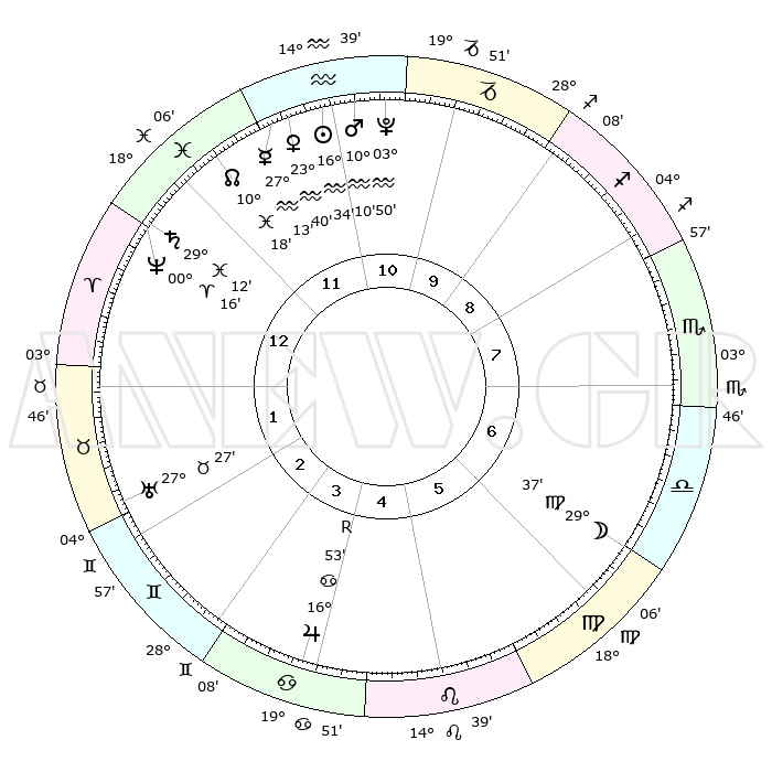| | ΘΕΣΕΙΣ ΠΛΑΝΗΤΩΝ ΑΣΤΡΟΛΟΓΙΚΟΥ ΧΑΡΤΗ ΤΗΣ ΣΤΙΓΜΗΣ ΑΥΤΗΣ | | | | Πλανήτης | Ζώδιο | Μοίρες | Δεκαήμ. | Σε οίκο | Απόκλιση | | Ακμές των οίκων | | Ηλιος | Υδροχόος | 16°30' | Δεύτερο | 11 | 15 S 53 | | 1ος | 03°09' | Κριός | | Σελήνη | Παρθένος | 28°55' | Τρίτο | 6 | 01 S 13 | | 2ος | 12°40' | Ταύρος | | Ερμής | Υδροχόος | 27°08' | Τρίτο | 12 | 13 S 54 | | 3ος | 09°36' | Δίδυμοι | | Αφροδίτη | Υδροχόος | 23°36' | Τρίτο | 12 | 14 S 59 | | 4ος | 01°46' | Καρκίνος | | Αρης | Υδροχόος | 10°07' | Δεύτερο | 11 | 18 S 43 | | 5ος | 24°13' | Καρκίνος | | Δίας | Καρκίνος | 16°54'R | Δεύτερο | 4 | 22 N 41 | | 6ος | 22°07' | Λέων | | Κρόνος | Ιχθείς | 29°11' | Τρίτο | 12 | 02 S 19 | | 7ος | 03°09' | Ζυγός | | Ουρανός | Ταύρος | 27°27' | Τρίτο | 2 | 19 N 24 | | 8ος | 12°40' | Σκορπιός | | Ποσειδώνας | Κριός | 00°16' | Πρώτο | 12 | 01 S 06 | | 9ος | 09°36' | Τοξότης | | Πλούτωνας | Υδροχόος | 03°50' | Πρώτο | 11 | 23 S 00 | | 10ος | 01°46' | Αιγόκερως | | Β. Δεσμός | Ιχθείς | 10°18' | Δεύτερο | 12 | 07 S 42 | | 11ος | 24°13' | Αιγόκερως | | Ωροσκόπος | Κριός | 03°09' | Πρώτο | | | 12ος | 22°07' | Υδροχόος | | Μεσουράνημα | Αιγόκερως | 01°46' | Πρώτο | | | |