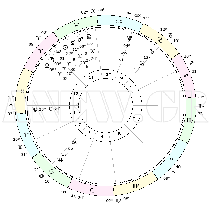 | | ΘΕΣΕΙΣ ΠΛΑΝΗΤΩΝ ΑΣΤΡΟΛΟΓΙΚΟΥ ΧΑΡΤΗ ΤΗΣ ΣΤΙΓΜΗΣ ΑΥΤΗΣ | | | | Πλανήτης | Ζώδιο | Μοίρες | Δεκαήμ. | Σε οίκο | Απόκλιση | | Ακμές των οίκων | | Ηλιος | Ιχθείς | 22°41' | Τρίτο | 12 | 02 S 54 | | 1ος | 24°58' | Κριός | | Σελήνη | Αιγόκερως | 13°01' | Δεύτερο | 9 | 27 S 09 | | 2ος | 28°35' | Ταύρος | | Ερμής | Ιχθείς | 11°26'R | Δεύτερο | 12 | 04 S 41 | | 3ος | 22°41' | Δίδυμοι | | Αφροδίτη | Κριός | 08°28' | Πρώτο | 12 | 02 N 21 | | 4ος | 14°22' | Καρκίνος | | Αρης | Ιχθείς | 08°24' | Πρώτο | 11 | 09 S 26 | | 5ος | 08°18' | Λέων | | Δίας | Καρκίνος | 15°06' | Δεύτερο | 4 | 22 N 56 | | 6ος | 10°02' | Παρθένος | | Κρόνος | Κριός | 03°20' | Πρώτο | 12 | 00 S 38 | | 7ος | 24°58' | Ζυγός | | Ουρανός | Ταύρος | 28°03' | Τρίτο | 1 | 19 N 33 | | 8ος | 28°35' | Σκορπιός | | Ποσειδώνας | Κριός | 01°30' | Πρώτο | 12 | 00 S 36 | | 9ος | 22°41' | Τοξότης | | Πλούτωνας | Υδροχόος | 04°51' | Πρώτο | 10 | 22 S 50 | | 10ος | 14°22' | Αιγόκερως | | Β. Δεσμός | Ιχθείς | 08°24' | Πρώτο | 11 | 08 S 25 | | 11ος | 08°18' | Υδροχόος | | Ωροσκόπος | Κριός | 24°58' | Τρίτο | | | 12ος | 10°02' | Ιχθείς | | Μεσουράνημα | Αιγόκερως | 14°22' | Δεύτερο | | | |