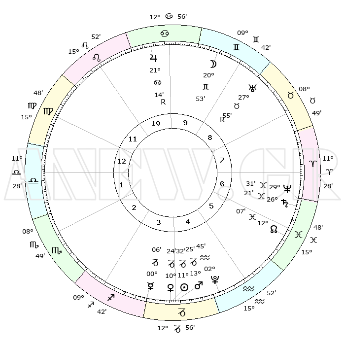 | | ΘΕΣΕΙΣ ΠΛΑΝΗΤΩΝ ΑΣΤΡΟΛΟΓΙΚΟΥ ΧΑΡΤΗ ΤΗΣ ΣΤΙΓΜΗΣ ΑΥΤΗΣ | | | | Πλανήτης | Ζώδιο | Μοίρες | Δεκαήμ. | Σε οίκο | Απόκλιση | | Ακμές των οίκων | | Ηλιος | Αιγόκερως | 11°27' | Δεύτερο | 4 | 22 S 56 | | 1ος | 20°35' | Παρθένος | | Σελήνη | Δίδυμοι | 19°49' | Δεύτερο | 10 | 28 N 02 | | 2ος | 16°26' | Ζυγός | | Ερμής | Τοξότης | 29°60' | Τρίτο | 4 | 24 S 06 | | 3ος | 16°29' | Σκορπιός | | Αφροδίτη | Αιγόκερως | 10°19' | Δεύτερο | 4 | 23 S 34 | | 4ος | 19°24' | Τοξότης | | Αρης | Αιγόκερως | 13°22' | Δεύτερο | 4 | 23 S 39 | | 5ος | 22°34' | Αιγόκερως | | Δίας | Καρκίνος | 21°14'R | Τρίτο | 10 | 22 N 00 | | 6ος | 23°22' | Υδροχόος | | Κρόνος | Ιχθείς | 26°20' | Τρίτο | 7 | 03 S 32 | | 7ος | 20°35' | Ιχθείς | | Ουρανός | Ταύρος | 27°55'R | Τρίτο | 9 | 19 N 30 | | 8ος | 16°26' | Κριός | | Ποσειδώνας | Ιχθείς | 29°31' | Τρίτο | 7 | 01 S 25 | | 9ος | 16°29' | Ταύρος | | Πλούτωνας | Υδροχόος | 02°45' | Πρώτο | 5 | 23 S 13 | | 10ος | 19°24' | Δίδυμοι | | Β. Δεσμός | Ιχθείς | 12°07' | Δεύτερο | 6 | 07 S 01 | | 11ος | 22°34' | Καρκίνος | | Ωροσκόπος | Παρθένος | 20°35' | Τρίτο | | | 12ος | 23°22' | Λέων | | Μεσουράνημα | Δίδυμοι | 19°24' | Δεύτερο | | | |