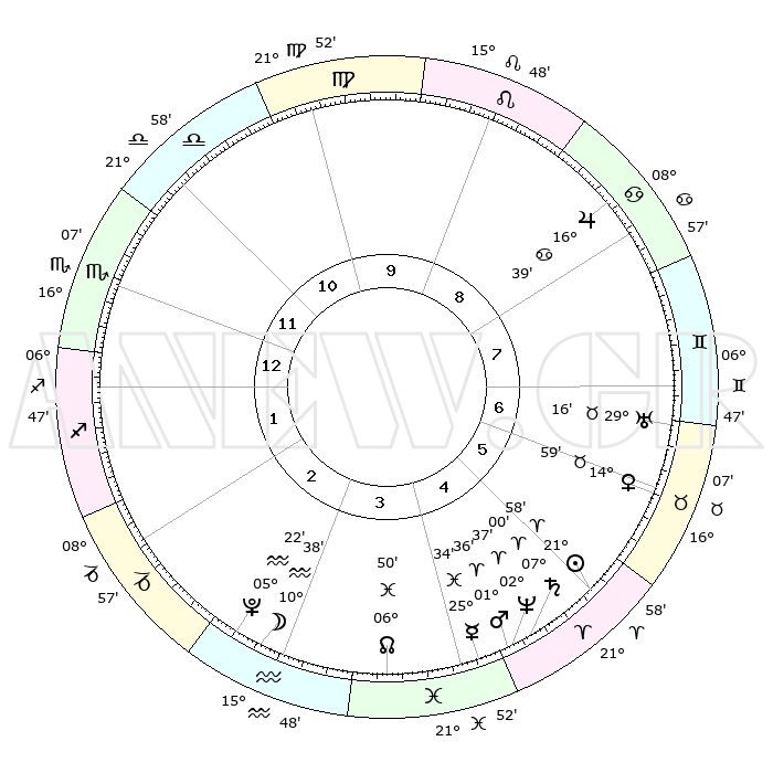 | | ΘΕΣΕΙΣ ΠΛΑΝΗΤΩΝ ΑΣΤΡΟΛΟΓΙΚΟΥ ΧΑΡΤΗ ΤΗΣ ΣΤΙΓΜΗΣ ΑΥΤΗΣ | | | | Πλανήτης | Ζώδιο | Μοίρες | Δεκαήμ. | Σε οίκο | Απόκλιση | | Ακμές των οίκων | | Ηλιος | Κριός | 21°54' | Τρίτο | 5 | 08 N 32 | | 1ος | 17°07' | Σκορπιός | | Σελήνη | Υδροχόος | 09°48' | Πρώτο | 3 | 20 S 09 | | 2ος | 16°47' | Τοξότης | | Ερμής | Ιχθείς | 25°28' | Τρίτο | 4 | 04 S 03 | | 3ος | 20°33' | Αιγόκερως | | Αφροδίτη | Ταύρος | 14°54' | Δεύτερο | 6 | 16 N 20 | | 4ος | 25°58' | Υδροχόος | | Αρης | Κριός | 01°33' | Πρώτο | 5 | 00 S 18 | | 5ος | 28°15' | Ιχθείς | | Δίας | Καρκίνος | 16°39' | Δεύτερο | 8 | 22 N 46 | | 6ος | 25°01' | Κριός | | Κρόνος | Κριός | 06°60' | Πρώτο | 5 | 00 N 49 | | 7ος | 17°07' | Ταύρος | | Ουρανός | Ταύρος | 29°16' | Τρίτο | 7 | 19 N 49 | | 8ος | 16°47' | Δίδυμοι | | Ποσειδώνας | Κριός | 02°36' | Πρώτο | 5 | 00 S 10 | | 9ος | 20°33' | Καρκίνος | | Πλούτωνας | Υδροχόος | 05°22' | Πρώτο | 3 | 22 S 47 | | 10ος | 25°58' | Λέων | | Β. Δεσμός | Ιχθείς | 06°50' | Πρώτο | 4 | 09 S 00 | | 11ος | 28°15' | Παρθένος | | Ωροσκόπος | Σκορπιός | 17°07' | Δεύτερο | | | 12ος | 25°01' | Ζυγός | | Μεσουράνημα | Λέων | 25°58' | Τρίτο | | | |