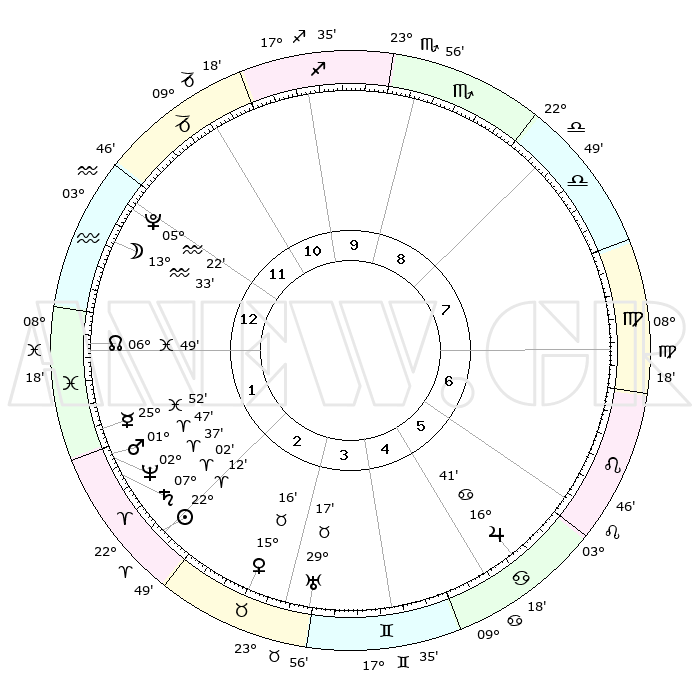 | | ΘΕΣΕΙΣ ΠΛΑΝΗΤΩΝ ΑΣΤΡΟΛΟΓΙΚΟΥ ΧΑΡΤΗ ΤΗΣ ΣΤΙΓΜΗΣ ΑΥΤΗΣ | | | | Πλανήτης | Ζώδιο | Μοίρες | Δεκαήμ. | Σε οίκο | Απόκλιση | | Ακμές των οίκων | | Ηλιος | Κριός | 22°08' | Τρίτο | 2 | 08 N 37 | | 1ος | 01°55' | Υδροχόος | | Σελήνη | Υδροχόος | 12°38' | Δεύτερο | 1 | 19 S 09 | | 2ος | 16°19' | Ιχθείς | | Ερμής | Ιχθείς | 25°46' | Τρίτο | 2 | 03 S 57 | | 3ος | 24°27' | Κριός | | Αφροδίτη | Ταύρος | 15°11' | Δεύτερο | 3 | 16 N 25 | | 4ος | 22°36' | Ταύρος | | Αρης | Κριός | 01°43' | Πρώτο | 2 | 00 S 14 | | 5ος | 15°13' | Δίδυμοι | | Δίας | Καρκίνος | 16°40' | Δεύτερο | 6 | 22 N 46 | | 6ος | 06°43' | Καρκίνος | | Κρόνος | Κριός | 07°01' | Πρώτο | 2 | 00 N 49 | | 7ος | 01°55' | Λέων | | Ουρανός | Ταύρος | 29°16' | Τρίτο | 4 | 19 N 50 | | 8ος | 16°19' | Παρθένος | | Ποσειδώνας | Κριός | 02°37' | Πρώτο | 2 | 00 S 10 | | 9ος | 24°27' | Ζυγός | | Πλούτωνας | Υδροχόος | 05°22' | Πρώτο | 1 | 22 S 47 | | 10ος | 22°36' | Σκορπιός | | Β. Δεσμός | Ιχθείς | 06°49' | Πρώτο | 1 | 09 S 00 | | 11ος | 15°13' | Τοξότης | | Ωροσκόπος | Υδροχόος | 01°55' | Πρώτο | | | 12ος | 06°43' | Αιγόκερως | | Μεσουράνημα | Σκορπιός | 22°36' | Τρίτο | | | |