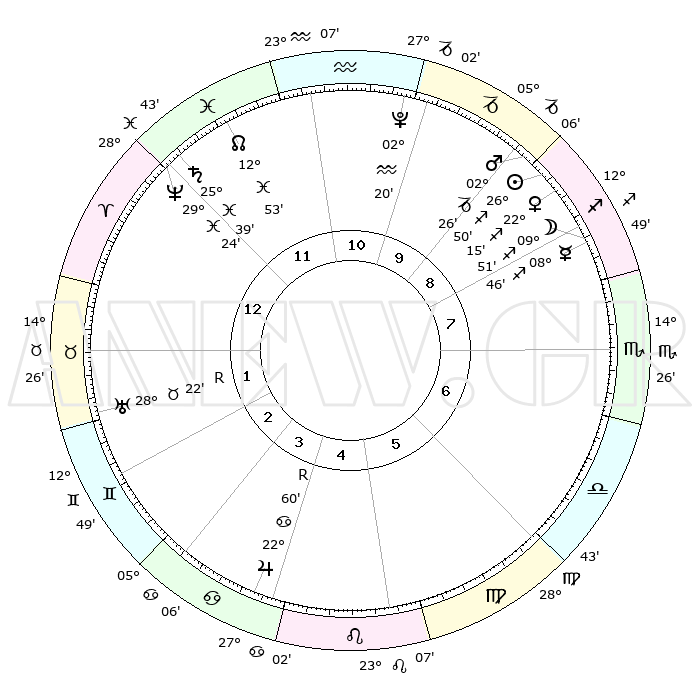 | | ΘΕΣΕΙΣ ΠΛΑΝΗΤΩΝ ΑΣΤΡΟΛΟΓΙΚΟΥ ΧΑΡΤΗ ΤΗΣ ΣΤΙΓΜΗΣ ΑΥΤΗΣ | | | | Πλανήτης | Ζώδιο | Μοίρες | Δεκαήμ. | Σε οίκο | Απόκλιση | | Ακμές των οίκων | | Ηλιος | Τοξότης | 26°27' | Τρίτο | 1 | 23 S 23 | | 1ος | 27°22' | Σκορπιός | | Σελήνη | Τοξότης | 05°18' | Πρώτο | 1 | 26 S 04 | | 2ος | 28°09' | Τοξότης | | Ερμής | Τοξότης | 08°14' | Πρώτο | 1 | 20 S 33 | | 3ος | 03°25' | Υδροχόος | | Αφροδίτη | Τοξότης | 21°46' | Τρίτο | 1 | 23 S 08 | | 4ος | 09°23' | Ιχθείς | | Αρης | Αιγόκερως | 02°09' | Πρώτο | 2 | 24 S 13 | | 5ος | 10°44' | Κριός | | Δίας | Καρκίνος | 23°02'R | Τρίτο | 8 | 21 N 40 | | 6ος | 06°09' | Ταύρος | | Κρόνος | Ιχθείς | 25°38' | Τρίτο | 4 | 03 S 51 | | 7ος | 27°22' | Ταύρος | | Ουρανός | Ταύρος | 28°23'R | Τρίτο | 7 | 19 N 36 | | 8ος | 28°09' | Δίδυμοι | | Ποσειδώνας | Ιχθείς | 29°23' | Τρίτο | 4 | 01 S 28 | | 9ος | 03°25' | Λέων | | Πλούτωνας | Υδροχόος | 02°19' | Πρώτο | 2 | 23 S 18 | | 10ος | 09°23' | Παρθένος | | Β. Δεσμός | Ιχθείς | 12°54' | Δεύτερο | 4 | 06 S 43 | | 11ος | 10°44' | Ζυγός | | Ωροσκόπος | Σκορπιός | 27°22' | Τρίτο | | | 12ος | 06°09' | Σκορπιός | | Μεσουράνημα | Παρθένος | 09°23' | Πρώτο | | | |