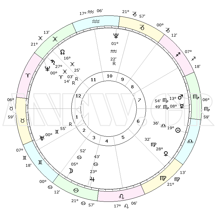 | ΘΕΣΕΙΣ ΠΛΑΝΗΤΩΝ ΑΣΤΡΟΛΟΓΙΚΟΥ ΧΑΡΤΗ ΤΗΣ ΣΤΙΓΜΗΣ ΑΥΤΗΣ | | Πλανήτης | Ζώδιο | Μοίρες | Δεκαήμ. | Σε οίκο | Απόκλιση | | Ακμές των οίκων | Ηλιος | Ζυγός | 19°31' | Δεύτερο | 7 | 07 S 38 | | 1ος | 12°48' | Ιχθείς | Σελήνη | Καρκίνος | 04°31' | Πρώτο | 4 | 28 N 21 | | 2ος | 26°39' | Κριός | Ερμής | Σκορπιός | 08°41' | Πρώτο | 8 | 15 S 47 | | 3ος | 26°56' | Ταύρος | Αφροδίτη | Παρθένος | 28°24' | Τρίτο | 7 | 02 N 00 | | 4ος | 20°14' | Δίδυμοι | Αρης | Σκορπιός | 13°50' | Δεύτερο | 8 | 16 S 11 | | 5ος | 12°00' | Καρκίνος | Δίας | Καρκίνος | 23°43' | Τρίτο | 5 | 21 N 24 | | 6ος | 07°01' | Λέων | Κρόνος | Ιχθείς | 27°03'R | Τρίτο | 1 | 03 S 28 | | 7ος | 12°48' | Παρθένος | Ουρανός | Δίδυμοι | 00°55'R | Πρώτο | 3 | 20 N 08 | | 8ος | 26°39' | Ζυγός | Ποσειδώνας | Κριός | 00°14'R | Πρώτο | 1 | 01 S 10 | | 9ος | 26°56' | Σκορπιός | Πλούτωνας | Υδροχόος | 01°22'R | Πρώτο | 11 | 23 S 32 | | 10ος | 20°14' | Τοξότης | Β. Δεσμός | Ιχθείς | 16°26' | Δεύτερο | 1 | 05 S 21 | | 11ος | 12°00' | Αιγόκερως | Ωροσκόπος | Ιχθείς | 12°48' | Δεύτερο | | | 12ος | 07°01' | Υδροχόος | Μεσουράνημα | Τοξότης | 20°14' | Τρίτο | | | |