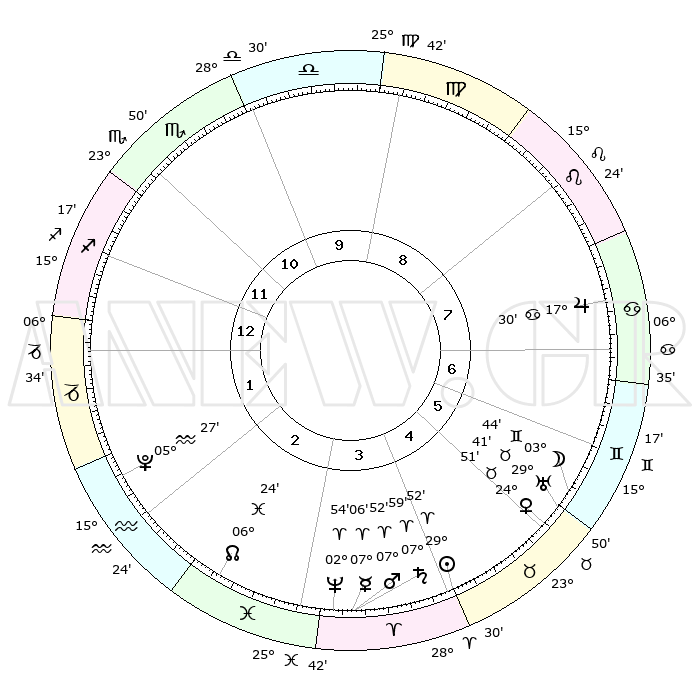 | | ΘΕΣΕΙΣ ΠΛΑΝΗΤΩΝ ΑΣΤΡΟΛΟΓΙΚΟΥ ΧΑΡΤΗ ΤΗΣ ΣΤΙΓΜΗΣ ΑΥΤΗΣ | | | | Πλανήτης | Ζώδιο | Μοίρες | Δεκαήμ. | Σε οίκο | Απόκλιση | | Ακμές των οίκων | | Ηλιος | Κριός | 29°49' | Τρίτο | 4 | 11 N 24 | | 1ος | 17°35' | Τοξότης | | Σελήνη | Δίδυμοι | 02°52' | Πρώτο | 6 | 25 N 43 | | 2ος | 21°48' | Αιγόκερως | | Ερμής | Κριός | 07°00' | Πρώτο | 4 | 00 N 22 | | 3ος | 00°24' | Ιχθείς | | Αφροδίτη | Ταύρος | 24°47' | Τρίτο | 5 | 19 N 20 | | 4ος | 05°55' | Κριός | | Αρης | Κριός | 07°49' | Πρώτο | 4 | 02 N 13 | | 5ος | 04°18' | Ταύρος | | Δίας | Καρκίνος | 17°30' | Δεύτερο | 7 | 22 N 40 | | 6ος | 27°10' | Ταύρος | | Κρόνος | Κριός | 07°58' | Πρώτο | 4 | 01 N 11 | | 7ος | 17°35' | Δίδυμοι | | Ουρανός | Ταύρος | 29°40' | Τρίτο | 6 | 19 N 55 | | 8ος | 21°48' | Καρκίνος | | Ποσειδώνας | Κριός | 02°54' | Πρώτο | 3 | 00 S 03 | | 9ος | 00°24' | Παρθένος | | Πλούτωνας | Υδροχόος | 05°27' | Πρώτο | 2 | 22 S 48 | | 10ος | 05°55' | Ζυγός | | Β. Δεσμός | Ιχθείς | 06°24' | Πρώτο | 3 | 09 S 10 | | 11ος | 04°18' | Σκορπιός | | Ωροσκόπος | Τοξότης | 17°35' | Δεύτερο | | | 12ος | 27°10' | Σκορπιός | | Μεσουράνημα | Ζυγός | 05°55' | Πρώτο | | | |
