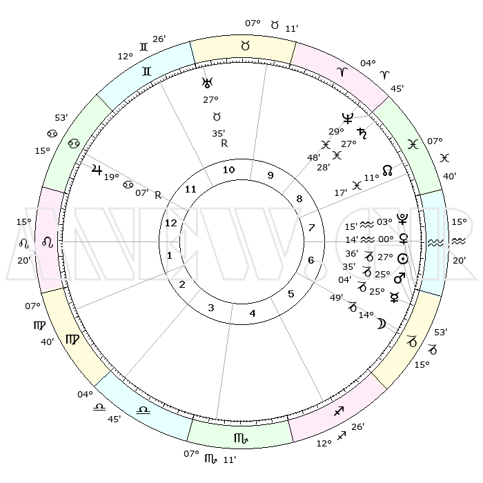 | | ΘΕΣΕΙΣ ΠΛΑΝΗΤΩΝ ΑΣΤΡΟΛΟΓΙΚΟΥ ΧΑΡΤΗ ΤΗΣ ΣΤΙΓΜΗΣ ΑΥΤΗΣ | | | | Πλανήτης | Ζώδιο | Μοίρες | Δεκαήμ. | Σε οίκο | Απόκλιση | | Ακμές των οίκων | | Ηλιος | Αιγόκερως | 27°32' | Τρίτο | 7 | 20 S 39 | | 1ος | 26°45' | Καρκίνος | | Σελήνη | Αιγόκερως | 14°02' | Δεύτερο | 6 | 26 S 55 | | 2ος | 17°35' | Λέων | | Ερμής | Αιγόκερως | 24°57' | Τρίτο | 6 | 23 S 01 | | 3ος | 12°12' | Παρθένος | | Αφροδίτη | Υδροχόος | 00°09' | Πρώτο | 7 | 21 S 09 | | 4ος | 12°48' | Ζυγός | | Αρης | Αιγόκερως | 25°32' | Τρίτο | 6 | 22 S 00 | | 5ος | 18°54' | Σκορπιός | | Δίας | Καρκίνος | 19°08'R | Δεύτερο | 12 | 22 N 21 | | 6ος | 25°09' | Τοξότης | | Κρόνος | Ιχθείς | 27°27' | Τρίτο | 9 | 03 S 02 | | 7ος | 26°45' | Αιγόκερως | | Ουρανός | Ταύρος | 27°35'R | Τρίτο | 11 | 19 N 26 | | 8ος | 17°35' | Υδροχόος | | Ποσειδώνας | Ιχθείς | 29°47' | Τρίτο | 9 | 01 S 18 | | 9ος | 12°12' | Ιχθείς | | Πλούτωνας | Υδροχόος | 03°15' | Πρώτο | 7 | 23 S 07 | | 10ος | 12°48' | Κριός | | Β. Δεσμός | Ιχθείς | 11°17' | Δεύτερο | 8 | 07 S 20 | | 11ος | 18°54' | Ταύρος | | Ωροσκόπος | Καρκίνος | 26°45' | Τρίτο | | | 12ος | 25°09' | Δίδυμοι | | Μεσουράνημα | Κριός | 12°48' | Δεύτερο | | | |