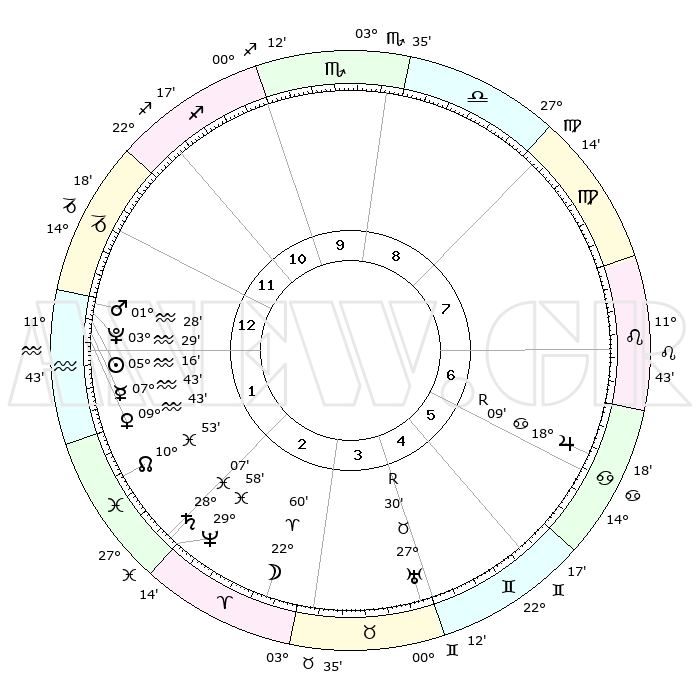 | | ΘΕΣΕΙΣ ΠΛΑΝΗΤΩΝ ΑΣΤΡΟΛΟΓΙΚΟΥ ΧΑΡΤΗ ΤΗΣ ΣΤΙΓΜΗΣ ΑΥΤΗΣ | | | | Πλανήτης | Ζώδιο | Μοίρες | Δεκαήμ. | Σε οίκο | Απόκλιση | | Ακμές των οίκων | | Ηλιος | Υδροχόος | 05°12' | Πρώτο | 1 | 18 S 58 | | 1ος | 12°12' | Αιγόκερως | | Σελήνη | Κριός | 22°01' | Τρίτο | 3 | 11 N 51 | | 2ος | 22°28' | Υδροχόος | | Ερμής | Υδροχόος | 07°36' | Πρώτο | 1 | 20 S 23 | | 3ος | 02°42' | Κριός | | Αφροδίτη | Υδροχόος | 09°37' | Πρώτο | 1 | 19 S 02 | | 4ος | 04°28' | Ταύρος | | Αρης | Υδροχόος | 01°24' | Πρώτο | 1 | 20 S 50 | | 5ος | 29°01' | Ταύρος | | Δίας | Καρκίνος | 18°10'R | Δεύτερο | 7 | 22 N 29 | | 6ος | 20°18' | Δίδυμοι | | Κρόνος | Ιχθείς | 28°07' | Τρίτο | 2 | 02 S 46 | | 7ος | 12°12' | Καρκίνος | | Ουρανός | Ταύρος | 27°30'R | Τρίτο | 4 | 19 N 25 | | 8ος | 22°28' | Λέων | | Ποσειδώνας | Ιχθείς | 29°58' | Τρίτο | 2 | 01 S 13 | | 9ος | 02°42' | Ζυγός | | Πλούτωνας | Υδροχόος | 03°29' | Πρώτο | 1 | 23 S 04 | | 10ος | 04°28' | Σκορπιός | | Β. Δεσμός | Ιχθείς | 10°53' | Δεύτερο | 2 | 07 S 29 | | 11ος | 29°01' | Σκορπιός | | Ωροσκόπος | Αιγόκερως | 12°12' | Δεύτερο | | | 12ος | 20°18' | Τοξότης | | Μεσουράνημα | Σκορπιός | 04°28' | Πρώτο | | | |