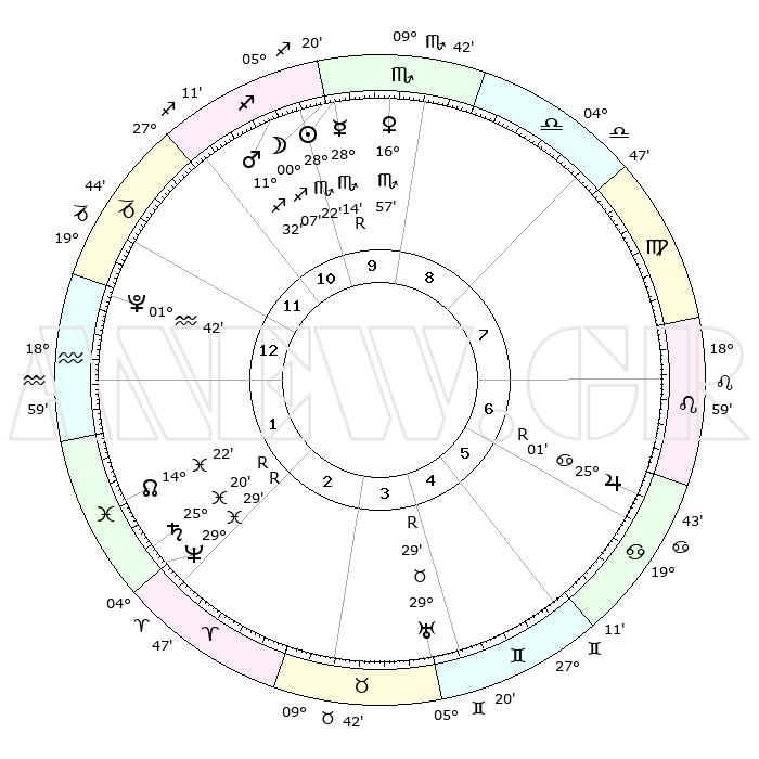 | | ΘΕΣΕΙΣ ΠΛΑΝΗΤΩΝ ΑΣΤΡΟΛΟΓΙΚΟΥ ΧΑΡΤΗ ΤΗΣ ΣΤΙΓΜΗΣ ΑΥΤΗΣ | | | | Πλανήτης | Ζώδιο | Μοίρες | Δεκαήμ. | Σε οίκο | Απόκλιση | | Ακμές των οίκων | | Ηλιος | Σκορπιός | 28°18' | Τρίτο | 10 | 19 S 46 | | 1ος | 19°53' | Αιγόκερως | | Σελήνη | Σκορπιός | 29°20' | Τρίτο | 10 | 24 S 42 | | 2ος | 01°60' | Ιχθείς | | Ερμής | Σκορπιός | 28°19'R | Τρίτο | 10 | 19 S 15 | | 3ος | 11°44' | Κριός | | Αφροδίτη | Σκορπιός | 16°52' | Δεύτερο | 10 | 15 S 51 | | 4ος | 12°02' | Ταύρος | | Αρης | Τοξότης | 11°29' | Δεύτερο | 11 | 22 S 43 | | 5ος | 05°42' | Δίδυμοι | | Δίας | Καρκίνος | 25°01'R | Τρίτο | 7 | 21 N 15 | | 6ος | 26°54' | Δίδυμοι | | Κρόνος | Ιχθείς | 25°20'R | Τρίτο | 2 | 04 S 04 | | 7ος | 19°53' | Καρκίνος | | Ουρανός | Ταύρος | 29°29'R | Τρίτο | 4 | 19 N 50 | | 8ος | 01°60' | Παρθένος | | Ποσειδώνας | Ιχθείς | 29°29'R | Τρίτο | 2 | 01 S 27 | | 9ος | 11°44' | Ζυγός | | Πλούτωνας | Υδροχόος | 01°42' | Πρώτο | 1 | 23 S 27 | | 10ος | 12°02' | Σκορπιός | | Β. Δεσμός | Ιχθείς | 14°22' | Δεύτερο | 2 | 06 S 09 | | 11ος | 05°42' | Τοξότης | | Ωροσκόπος | Αιγόκερως | 19°53' | Δεύτερο | | | 12ος | 26°54' | Τοξότης | | Μεσουράνημα | Σκορπιός | 12°02' | Δεύτερο | | | |