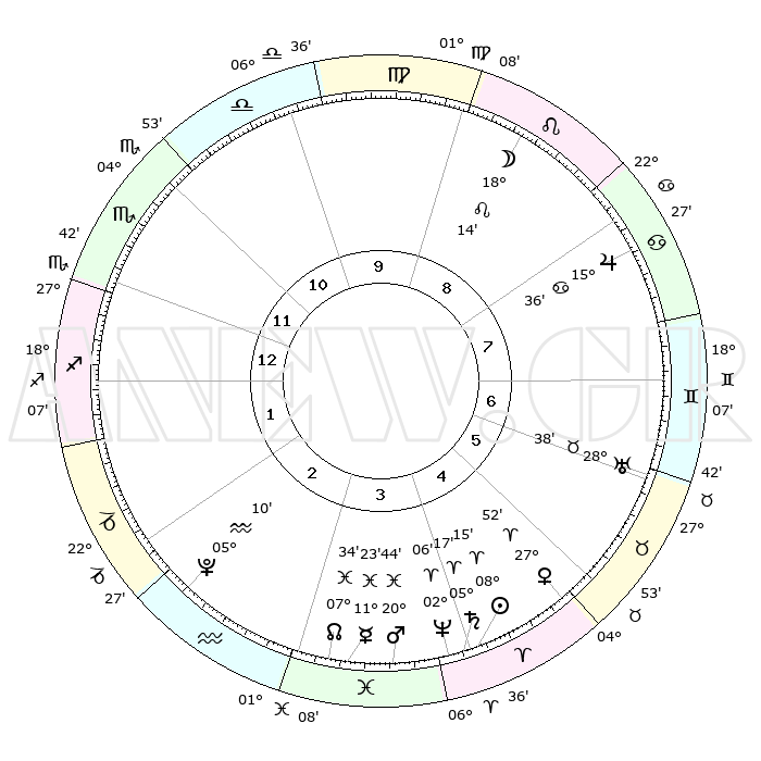 | | ΘΕΣΕΙΣ ΠΛΑΝΗΤΩΝ ΑΣΤΡΟΛΟΓΙΚΟΥ ΧΑΡΤΗ ΤΗΣ ΣΤΙΓΜΗΣ ΑΥΤΗΣ | | | | Πλανήτης | Ζώδιο | Μοίρες | Δεκαήμ. | Σε οίκο | Απόκλιση | | Ακμές των οίκων | | Ηλιος | Κριός | 08°11' | Πρώτο | 4 | 03 N 15 | | 1ος | 26°47' | Σκορπιός | | Σελήνη | Λέων | 17°16' | Δεύτερο | 9 | 17 N 29 | | 2ος | 27°29' | Τοξότης | | Ερμής | Ιχθείς | 11°20' | Δεύτερο | 4 | 08 S 01 | | 3ος | 02°40' | Υδροχόος | | Αφροδίτη | Κριός | 27°47' | Τρίτο | 5 | 10 N 09 | | 4ος | 08°37' | Ιχθείς | | Αρης | Ιχθείς | 20°40' | Τρίτο | 4 | 04 S 40 | | 5ος | 10°02' | Κριός | | Δίας | Καρκίνος | 15°35' | Δεύτερο | 8 | 22 N 53 | | 6ος | 05°31' | Ταύρος | | Κρόνος | Κριός | 05°16' | Πρώτο | 4 | 00 N 08 | | 7ος | 26°47' | Ταύρος | | Ουρανός | Ταύρος | 28°38' | Τρίτο | 7 | 19 N 41 | | 8ος | 27°29' | Δίδυμοι | | Ποσειδώνας | Κριός | 02°06' | Πρώτο | 4 | 00 S 22 | | 9ος | 02°40' | Λέων | | Πλούτωνας | Υδροχόος | 05°10' | Πρώτο | 3 | 22 S 48 | | 10ος | 08°37' | Παρθένος | | Β. Δεσμός | Ιχθείς | 07°34' | Πρώτο | 3 | 08 S 44 | | 11ος | 10°02' | Ζυγός | | Ωροσκόπος | Σκορπιός | 26°47' | Τρίτο | | | 12ος | 05°31' | Σκορπιός | | Μεσουράνημα | Παρθένος | 08°37' | Πρώτο | | | |