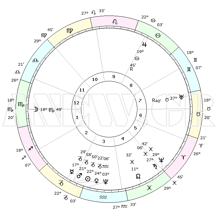 | | ΘΕΣΕΙΣ ΠΛΑΝΗΤΩΝ ΑΣΤΡΟΛΟΓΙΚΟΥ ΧΑΡΤΗ ΤΗΣ ΣΤΙΓΜΗΣ ΑΥΤΗΣ | | | | Πλανήτης | Ζώδιο | Μοίρες | Δεκαήμ. | Σε οίκο | Απόκλιση | | Ακμές των οίκων | | Ηλιος | Αιγόκερως | 22°45' | Τρίτο | 3 | 21 S 31 | | 1ος | 23°57' | Ζυγός | | Σελήνη | Σκορπιός | 17°49' | Δεύτερο | 1 | 21 S 41 | | 2ος | 22°01' | Σκορπιός | | Ερμής | Αιγόκερως | 17°21' | Δεύτερο | 3 | 23 S 57 | | 3ος | 23°32' | Τοξότης | | Αφροδίτη | Αιγόκερως | 24°15' | Τρίτο | 3 | 22 S 10 | | 4ος | 27°21' | Αιγόκερως | | Αρης | Αιγόκερως | 21°54' | Τρίτο | 3 | 22 S 36 | | 5ος | 00°18' | Ιχθείς | | Δίας | Καρκίνος | 19°45'R | Δεύτερο | 9 | 22 N 15 | | 6ος | 29°28' | Ιχθείς | | Κρόνος | Ιχθείς | 27°05' | Τρίτο | 5 | 03 S 12 | | 7ος | 23°57' | Κριός | | Ουρανός | Ταύρος | 27°40'R | Τρίτο | 8 | 19 N 27 | | 8ος | 22°01' | Ταύρος | | Ποσειδώνας | Ιχθείς | 29°42' | Τρίτο | 6 | 01 S 20 | | 9ος | 23°32' | Δίδυμοι | | Πλούτωνας | Υδροχόος | 03°06' | Πρώτο | 4 | 23 S 09 | | 10ος | 27°21' | Καρκίνος | | Β. Δεσμός | Ιχθείς | 11°32' | Δεύτερο | 5 | 07 S 14 | | 11ος | 00°18' | Παρθένος | | Ωροσκόπος | Ζυγός | 23°57' | Τρίτο | | | 12ος | 29°28' | Παρθένος | | Μεσουράνημα | Καρκίνος | 27°21' | Τρίτο | | | |