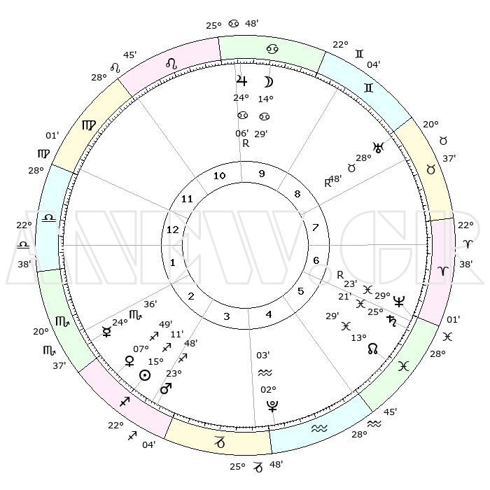 | | ΘΕΣΕΙΣ ΠΛΑΝΗΤΩΝ ΑΣΤΡΟΛΟΓΙΚΟΥ ΧΑΡΤΗ ΤΗΣ ΣΤΙΓΜΗΣ ΑΥΤΗΣ | | | | Πλανήτης | Ζώδιο | Μοίρες | Δεκαήμ. | Σε οίκο | Απόκλιση | | Ακμές των οίκων | | Ηλιος | Τοξότης | 15°08' | Δεύτερο | 3 | 22 S 36 | | 1ος | 11°01' | Ζυγός | | Σελήνη | Καρκίνος | 13°54' | Δεύτερο | 10 | 27 N 00 | | 2ος | 08°20' | Σκορπιός | | Ερμής | Σκορπιός | 24°34' | Τρίτο | 2 | 16 S 35 | | 3ος | 09°12' | Τοξότης | | Αφροδίτη | Τοξότης | 07°46' | Πρώτο | 2 | 21 S 08 | | 4ος | 12°25' | Αιγόκερως | | Αρης | Τοξότης | 23°47' | Τρίτο | 3 | 24 S 00 | | 5ος | 15°21' | Υδροχόος | | Δίας | Καρκίνος | 24°06'R | Τρίτο | 10 | 21 N 27 | | 6ος | 15°19' | Ιχθείς | | Κρόνος | Ιχθείς | 25°21' | Τρίτο | 6 | 04 S 00 | | 7ος | 11°01' | Κριός | | Ουρανός | Ταύρος | 28°48'R | Τρίτο | 8 | 19 N 41 | | 8ος | 08°20' | Ταύρος | | Ποσειδώνας | Ιχθείς | 29°23'R | Τρίτο | 6 | 01 S 29 | | 9ος | 09°12' | Δίδυμοι | | Πλούτωνας | Υδροχόος | 02°03' | Πρώτο | 4 | 23 S 22 | | 10ος | 12°25' | Καρκίνος | | Β. Δεσμός | Ιχθείς | 13°30' | Δεύτερο | 5 | 06 S 29 | | 11ος | 15°21' | Λέων | | Ωροσκόπος | Ζυγός | 11°01' | Δεύτερο | | | 12ος | 15°19' | Παρθένος | | Μεσουράνημα | Καρκίνος | 12°25' | Δεύτερο | | | |