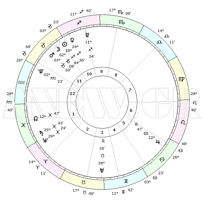 | | ΘΕΣΕΙΣ ΠΛΑΝΗΤΩΝ ΑΣΤΡΟΛΟΓΙΚΟΥ ΧΑΡΤΗ ΤΗΣ ΣΤΙΓΜΗΣ ΑΥΤΗΣ | | | | Πλανήτης | Ζώδιο | Μοίρες | Δεκαήμ. | Σε οίκο | Απόκλιση | | Ακμές των οίκων | | Ηλιος | Τοξότης | 28°40' | Τρίτο | 11 | 23 S 26 | | 1ος | 24°50' | Αιγόκερως | | Σελήνη | Αιγόκερως | 01°16' | Πρώτο | 12 | 28 S 09 | | 2ος | 07°60' | Ιχθείς | | Ερμής | Τοξότης | 11°18' | Δεύτερο | 11 | 21 S 17 | | 3ος | 17°11' | Κριός | | Αφροδίτη | Τοξότης | 24°30' | Τρίτο | 11 | 23 S 22 | | 4ος | 16°34' | Ταύρος | | Αρης | Αιγόκερως | 03°47' | Πρώτο | 12 | 24 S 11 | | 5ος | 09°45' | Δίδυμοι | | Δίας | Καρκίνος | 22°48'R | Τρίτο | 6 | 21 N 43 | | 6ος | 01°01' | Καρκίνος | | Κρόνος | Ιχθείς | 25°43' | Τρίτο | 2 | 03 S 49 | | 7ος | 24°50' | Καρκίνος | | Ουρανός | Ταύρος | 28°18'R | Τρίτο | 4 | 19 N 35 | | 8ος | 07°60' | Παρθένος | | Ποσειδώνας | Ιχθείς | 29°24' | Τρίτο | 2 | 01 S 28 | | 9ος | 17°11' | Ζυγός | | Πλούτωνας | Υδροχόος | 02°23' | Πρώτο | 1 | 23 S 18 | | 10ος | 16°34' | Σκορπιός | | Β. Δεσμός | Ιχθείς | 12°47' | Δεύτερο | 2 | 06 S 45 | | 11ος | 09°45' | Τοξότης | | Ωροσκόπος | Αιγόκερως | 24°50' | Τρίτο | | | 12ος | 01°01' | Αιγόκερως | | Μεσουράνημα | Σκορπιός | 16°34' | Δεύτερο | | | |