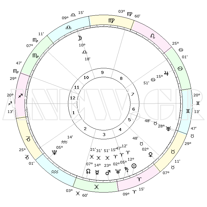 | | ΘΕΣΕΙΣ ΠΛΑΝΗΤΩΝ ΑΣΤΡΟΛΟΓΙΚΟΥ ΧΑΡΤΗ ΤΗΣ ΣΤΙΓΜΗΣ ΑΥΤΗΣ | | | | Πλανήτης | Ζώδιο | Μοίρες | Δεκαήμ. | Σε οίκο | Απόκλιση | | Ακμές των οίκων | | Ηλιος | Κριός | 12°08' | Δεύτερο | 4 | 04 N 48 | | 1ος | 01°24' | Τοξότης | | Σελήνη | Ζυγός | 09°31' | Πρώτο | 10 | 06 S 13 | | 2ος | 02°43' | Αιγόκερως | | Ερμής | Ιχθείς | 14°27' | Δεύτερο | 3 | 07 S 27 | | 3ος | 08°39' | Υδροχόος | | Αφροδίτη | Ταύρος | 02°43' | Πρώτο | 5 | 12 N 02 | | 4ος | 14°44' | Ιχθείς | | Αρης | Ιχθείς | 23°48' | Τρίτο | 4 | 03 S 25 | | 5ος | 15°35' | Κριός | | Δίας | Καρκίνος | 15°50' | Δεύτερο | 8 | 22 N 52 | | 6ος | 10°27' | Ταύρος | | Κρόνος | Κριός | 05°46' | Πρώτο | 4 | 00 N 20 | | 7ος | 01°24' | Δίδυμοι | | Ουρανός | Ταύρος | 28°48' | Τρίτο | 6 | 19 N 43 | | 8ος | 02°43' | Καρκίνος | | Ποσειδώνας | Κριός | 02°15' | Πρώτο | 4 | 00 S 19 | | 9ος | 08°39' | Λέων | | Πλούτωνας | Υδροχόος | 05°14' | Πρώτο | 2 | 22 S 47 | | 10ος | 14°44' | Παρθένος | | Β. Δεσμός | Ιχθείς | 07°21' | Πρώτο | 3 | 08 S 48 | | 11ος | 15°35' | Ζυγός | | Ωροσκόπος | Τοξότης | 01°24' | Πρώτο | | | 12ος | 10°27' | Σκορπιός | | Μεσουράνημα | Παρθένος | 14°44' | Δεύτερο | | | |