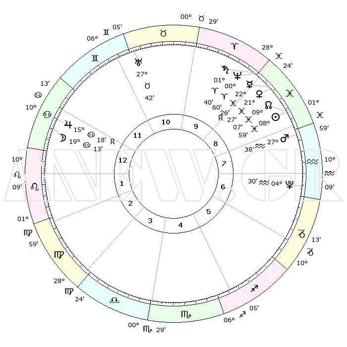 | | ΘΕΣΕΙΣ ΠΛΑΝΗΤΩΝ ΑΣΤΡΟΛΟΓΙΚΟΥ ΧΑΡΤΗ ΤΗΣ ΣΤΙΓΜΗΣ ΑΥΤΗΣ | | | | Πλανήτης | Ζώδιο | Μοίρες | Δεκαήμ. | Σε οίκο | Απόκλιση | | Ακμές των οίκων | | Ηλιος | Ιχθείς | 08°55' | Πρώτο | 9 | 08 S 13 | | 1ος | 22°16' | Καρκίνος | | Σελήνη | Καρκίνος | 18°21' | Δεύτερο | 12 | 26 N 14 | | 2ος | 12°53' | Λέων | | Ερμής | Ιχθείς | 22°27'R | Τρίτο | 9 | 00 S 12 | | 3ος | 06°55' | Παρθένος | | Αφροδίτη | Ιχθείς | 21°22' | Τρίτο | 9 | 04 S 41 | | 4ος | 06°52' | Ζυγός | | Αρης | Υδροχόος | 27°35' | Τρίτο | 8 | 13 S 20 | | 5ος | 12°56' | Σκορπιός | | Δίας | Καρκίνος | 15°18'R | Δεύτερο | 12 | 22 N 54 | | 6ος | 19°56' | Τοξότης | | Κρόνος | Κριός | 01°40' | Πρώτο | 9 | 01 S 18 | | 7ος | 22°16' | Αιγόκερως | | Ουρανός | Ταύρος | 27°42' | Τρίτο | 11 | 19 N 28 | | 8ος | 12°53' | Υδροχόος | | Ποσειδώνας | Κριός | 00°60' | Πρώτο | 9 | 00 S 48 | | 9ος | 06°55' | Ιχθείς | | Πλούτωνας | Υδροχόος | 04°30' | Πρώτο | 7 | 22 S 53 | | 10ος | 06°52' | Κριός | | Β. Δεσμός | Ιχθείς | 09°07' | Πρώτο | 9 | 08 S 09 | | 11ος | 12°56' | Ταύρος | | Ωροσκόπος | Καρκίνος | 22°16' | Τρίτο | | | 12ος | 19°56' | Δίδυμοι | | Μεσουράνημα | Κριός | 06°52' | Πρώτο | | | |