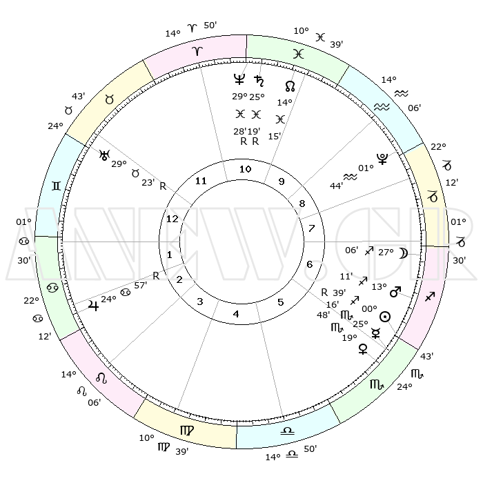 | | ΘΕΣΕΙΣ ΠΛΑΝΗΤΩΝ ΑΣΤΡΟΛΟΓΙΚΟΥ ΧΑΡΤΗ ΤΗΣ ΣΤΙΓΜΗΣ ΑΥΤΗΣ | | | | Πλανήτης | Ζώδιο | Μοίρες | Δεκαήμ. | Σε οίκο | Απόκλιση | | Ακμές των οίκων | | Ηλιος | Τοξότης | 00°36' | Πρώτο | 6 | 20 S 16 | | 1ος | 11°07' | Δίδυμοι | | Σελήνη | Τοξότης | 26°25' | Τρίτο | 7 | 28 S 17 | | 2ος | 03°56' | Καρκίνος | | Ερμής | Σκορπιός | 25°20'R | Τρίτο | 6 | 17 S 52 | | 3ος | 25°09' | Καρκίνος | | Αφροδίτη | Σκορπιός | 19°43' | Δεύτερο | 6 | 16 S 43 | | 4ος | 18°55' | Λέων | | Αρης | Τοξότης | 13°09' | Δεύτερο | 7 | 22 S 57 | | 5ος | 19°24' | Παρθένος | | Δίας | Καρκίνος | 24°57'R | Τρίτο | 2 | 21 N 16 | | 6ος | 29°14' | Ζυγός | | Κρόνος | Ιχθείς | 25°19'R | Τρίτο | 11 | 04 S 04 | | 7ος | 11°07' | Τοξότης | | Ουρανός | Ταύρος | 29°24'R | Τρίτο | 12 | 19 N 49 | | 8ος | 03°56' | Αιγόκερως | | Ποσειδώνας | Ιχθείς | 29°28'R | Τρίτο | 11 | 01 S 28 | | 9ος | 25°09' | Αιγόκερως | | Πλούτωνας | Υδροχόος | 01°44' | Πρώτο | 9 | 23 S 26 | | 10ος | 18°55' | Υδροχόος | | Β. Δεσμός | Ιχθείς | 14°15' | Δεύτερο | 10 | 06 S 12 | | 11ος | 19°24' | Ιχθείς | | Ωροσκόπος | Δίδυμοι | 11°07' | Δεύτερο | | | 12ος | 29°14' | Κριός | | Μεσουράνημα | Υδροχόος | 18°55' | Δεύτερο | | | |