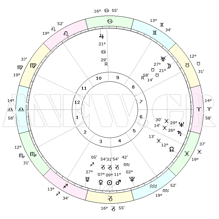 | | ΘΕΣΕΙΣ ΠΛΑΝΗΤΩΝ ΑΣΤΡΟΛΟΓΙΚΟΥ ΧΑΡΤΗ ΤΗΣ ΣΤΙΓΜΗΣ ΑΥΤΗΣ | | | | Πλανήτης | Ζώδιο | Μοίρες | Δεκαήμ. | Σε οίκο | Απόκλιση | | Ακμές των οίκων | | Ηλιος | Αιγόκερως | 09°26' | Πρώτο | 4 | 23 S 06 | | 1ος | 22°15' | Παρθένος | | Σελήνη | Ταύρος | 20°05' | Τρίτο | 9 | 22 N 19 | | 2ος | 18°15' | Ζυγός | | Ερμής | Τοξότης | 26°58' | Τρίτο | 4 | 23 S 51 | | 3ος | 18°21' | Σκορπιός | | Αφροδίτη | Αιγόκερως | 07°49' | Πρώτο | 4 | 23 S 40 | | 4ος | 21°17' | Τοξότης | | Αρης | Αιγόκερως | 11°50' | Δεύτερο | 4 | 23 S 47 | | 5ος | 24°25' | Αιγόκερως | | Δίας | Καρκίνος | 21°30'R | Τρίτο | 10 | 21 N 57 | | 6ος | 25°08' | Υδροχόος | | Κρόνος | Ιχθείς | 26°13' | Τρίτο | 7 | 03 S 35 | | 7ος | 22°15' | Ιχθείς | | Ουρανός | Ταύρος | 27°59'R | Τρίτο | 9 | 19 N 31 | | 8ος | 18°15' | Κριός | | Ποσειδώνας | Ιχθείς | 29°30' | Τρίτο | 7 | 01 S 25 | | 9ος | 18°21' | Ταύρος | | Πλούτωνας | Υδροχόος | 02°41' | Πρώτο | 5 | 23 S 14 | | 10ος | 21°17' | Δίδυμοι | | Β. Δεσμός | Ιχθείς | 12°14' | Δεύτερο | 6 | 06 S 58 | | 11ος | 24°25' | Καρκίνος | | Ωροσκόπος | Παρθένος | 22°15' | Τρίτο | | | 12ος | 25°08' | Λέων | | Μεσουράνημα | Δίδυμοι | 21°17' | Τρίτο | | | |