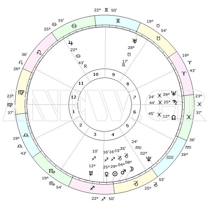 | | ΘΕΣΕΙΣ ΠΛΑΝΗΤΩΝ ΑΣΤΡΟΛΟΓΙΚΟΥ ΧΑΡΤΗ ΤΗΣ ΣΤΙΓΜΗΣ ΑΥΤΗΣ | | | | Πλανήτης | Ζώδιο | Μοίρες | Δεκαήμ. | Σε οίκο | Απόκλιση | | Ακμές των οίκων | | Ηλιος | Τοξότης | 29°11' | Τρίτο | 5 | 23 S 26 | | 1ος | 28°24' | Λέων | | Σελήνη | Αιγόκερως | 07°32' | Πρώτο | 5 | 27 S 44 | | 2ος | 22°05' | Παρθένος | | Ερμής | Τοξότης | 12°03' | Δεύτερο | 4 | 21 S 27 | | 3ος | 20°36' | Ζυγός | | Αφροδίτη | Τοξότης | 25°09' | Τρίτο | 4 | 23 S 25 | | 4ος | 23°30' | Σκορπιός | | Αρης | Αιγόκερως | 04°11' | Πρώτο | 5 | 24 S 11 | | 5ος | 27°48' | Τοξότης | | Δίας | Καρκίνος | 22°44'R | Τρίτο | 11 | 21 N 44 | | 6ος | 29°53' | Αιγόκερως | | Κρόνος | Ιχθείς | 25°44' | Τρίτο | 8 | 03 S 48 | | 7ος | 28°24' | Υδροχόος | | Ουρανός | Ταύρος | 28°17'R | Τρίτο | 10 | 19 N 35 | | 8ος | 22°05' | Ιχθείς | | Ποσειδώνας | Ιχθείς | 29°24' | Τρίτο | 8 | 01 S 28 | | 9ος | 20°36' | Κριός | | Πλούτωνας | Υδροχόος | 02°24' | Πρώτο | 6 | 23 S 17 | | 10ος | 23°30' | Ταύρος | | Β. Δεσμός | Ιχθείς | 12°46' | Δεύτερο | 7 | 06 S 46 | | 11ος | 27°48' | Δίδυμοι | | Ωροσκόπος | Λέων | 28°24' | Τρίτο | | | 12ος | 29°53' | Καρκίνος | | Μεσουράνημα | Ταύρος | 23°30' | Τρίτο | | | |