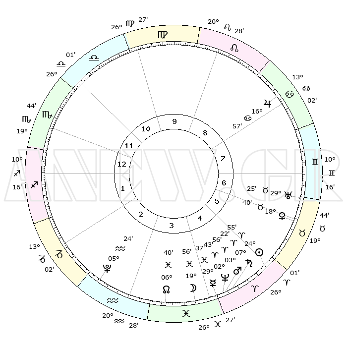 | | ΘΕΣΕΙΣ ΠΛΑΝΗΤΩΝ ΑΣΤΡΟΛΟΓΙΚΟΥ ΧΑΡΤΗ ΤΗΣ ΣΤΙΓΜΗΣ ΑΥΤΗΣ | | | | Πλανήτης | Ζώδιο | Μοίρες | Δεκαήμ. | Σε οίκο | Απόκλιση | | Ακμές των οίκων | | Ηλιος | Κριός | 24°48' | Τρίτο | 6 | 09 N 36 | | 1ος | 05°49' | Σκορπιός | | Σελήνη | Ιχθείς | 18°19' | Δεύτερο | 5 | 03 S 47 | | 2ος | 04°36' | Τοξότης | | Ερμής | Ιχθείς | 29°27' | Τρίτο | 5 | 02 S 35 | | 3ος | 07°04' | Αιγόκερως | | Αφροδίτη | Ταύρος | 18°31' | Δεύτερο | 7 | 17 N 29 | | 4ος | 11°40' | Υδροχόος | | Αρης | Κριός | 03°50' | Πρώτο | 5 | 00 N 37 | | 5ος | 14°29' | Ιχθείς | | Δίας | Καρκίνος | 16°56' | Δεύτερο | 9 | 22 N 44 | | 6ος | 12°35' | Κριός | | Κρόνος | Κριός | 07°21' | Πρώτο | 5 | 00 N 57 | | 7ος | 05°49' | Ταύρος | | Ουρανός | Ταύρος | 29°25' | Τρίτο | 7 | 19 N 51 | | 8ος | 04°36' | Δίδυμοι | | Ποσειδώνας | Κριός | 02°43' | Πρώτο | 5 | 00 S 08 | | 9ος | 07°04' | Καρκίνος | | Πλούτωνας | Υδροχόος | 05°24' | Πρώτο | 3 | 22 S 47 | | 10ος | 11°40' | Λέων | | Β. Δεσμός | Ιχθείς | 06°41' | Πρώτο | 4 | 09 S 04 | | 11ος | 14°28' | Παρθένος | | Ωροσκόπος | Σκορπιός | 05°49' | Πρώτο | | | 12ος | 12°35' | Ζυγός | | Μεσουράνημα | Λέων | 11°40' | Δεύτερο | | | |