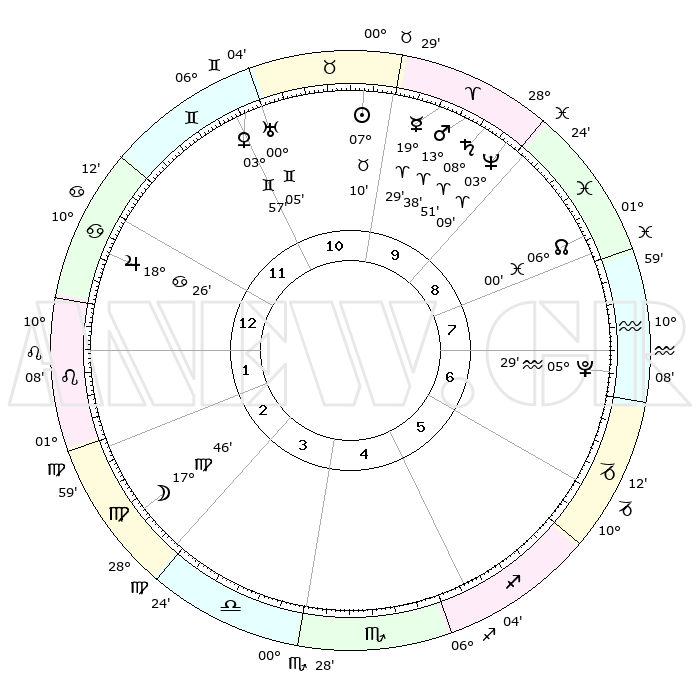 | | ΘΕΣΕΙΣ ΠΛΑΝΗΤΩΝ ΑΣΤΡΟΛΟΓΙΚΟΥ ΧΑΡΤΗ ΤΗΣ ΣΤΙΓΜΗΣ ΑΥΤΗΣ | | | | Πλανήτης | Ζώδιο | Μοίρες | Δεκαήμ. | Σε οίκο | Απόκλιση | | Ακμές των οίκων | | Ηλιος | Ταύρος | 07°06' | Πρώτο | 10 | 13 N 53 | | 1ος | 21°51' | Καρκίνος | | Σελήνη | Παρθένος | 16°58' | Δεύτερο | 3 | 04 N 22 | | 2ος | 12°27' | Λέων | | Ερμής | Κριός | 19°22' | Δεύτερο | 10 | 05 N 29 | | 3ος | 06°25' | Παρθένος | | Αφροδίτη | Δίδυμοι | 03°53' | Πρώτο | 11 | 21 N 39 | | 4ος | 06°19' | Ζυγός | | Αρης | Κριός | 13°35' | Δεύτερο | 10 | 04 N 31 | | 5ος | 12°22' | Σκορπιός | | Δίας | Καρκίνος | 18°25' | Δεύτερο | 12 | 22 N 33 | | 6ος | 19°27' | Τοξότης | | Κρόνος | Κριός | 08°51' | Πρώτο | 10 | 01 N 31 | | 7ος | 21°51' | Αιγόκερως | | Ουρανός | Δίδυμοι | 00°05' | Πρώτο | 11 | 20 N 00 | | 8ος | 12°27' | Υδροχόος | | Ποσειδώνας | Κριός | 03°09' | Πρώτο | 9 | 00 N 02 | | 9ος | 06°25' | Ιχθείς | | Πλούτωνας | Υδροχόος | 05°29' | Πρώτο | 7 | 22 S 48 | | 10ος | 06°19' | Κριός | | Β. Δεσμός | Ιχθείς | 06°00' | Πρώτο | 8 | 09 S 18 | | 11ος | 12°22' | Ταύρος | | Ωροσκόπος | Καρκίνος | 21°51' | Τρίτο | | | 12ος | 19°27' | Δίδυμοι | | Μεσουράνημα | Κριός | 06°19' | Πρώτο | | | |