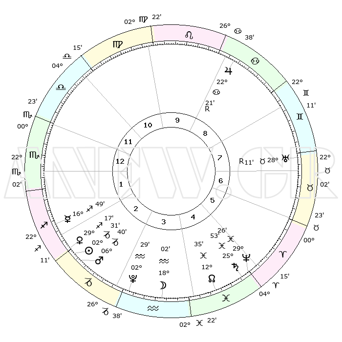| | ΘΕΣΕΙΣ ΠΛΑΝΗΤΩΝ ΑΣΤΡΟΛΟΓΙΚΟΥ ΧΑΡΤΗ ΤΗΣ ΣΤΙΓΜΗΣ ΑΥΤΗΣ | | | | Πλανήτης | Ζώδιο | Μοίρες | Δεκαήμ. | Σε οίκο | Απόκλιση | | Ακμές των οίκων | | Ηλιος | Αιγόκερως | 02°27' | Πρώτο | 3 | 23 S 25 | | 1ος | 29°29' | Ζυγός | | Σελήνη | Υδροχόος | 17°03' | Δεύτερο | 4 | 17 S 42 | | 2ος | 27°52' | Σκορπιός | | Ερμής | Τοξότης | 16°42' | Δεύτερο | 2 | 22 S 23 | | 3ος | 29°47' | Τοξότης | | Αφροδίτη | Τοξότης | 29°11' | Τρίτο | 2 | 23 S 38 | | 4ος | 03°57' | Υδροχόος | | Αρης | Αιγόκερως | 06°37' | Πρώτο | 3 | 24 S 06 | | 5ος | 06°52' | Ιχθείς | | Δίας | Καρκίνος | 22°21'R | Τρίτο | 9 | 21 N 48 | | 6ος | 05°35' | Κριός | | Κρόνος | Ιχθείς | 25°52' | Τρίτο | 5 | 03 S 44 | | 7ος | 29°29' | Κριός | | Ουρανός | Ταύρος | 28°11'R | Τρίτο | 8 | 19 N 33 | | 8ος | 27°52' | Ταύρος | | Ποσειδώνας | Ιχθείς | 29°26' | Τρίτο | 5 | 01 S 27 | | 9ος | 29°47' | Δίδυμοι | | Πλούτωνας | Υδροχόος | 02°29' | Πρώτο | 3 | 23 S 16 | | 10ος | 03°57' | Λέων | | Β. Δεσμός | Ιχθείς | 12°35' | Δεύτερο | 5 | 06 S 50 | | 11ος | 06°52' | Παρθένος | | Ωροσκόπος | Ζυγός | 29°29' | Τρίτο | | | 12ος | 05°35' | Ζυγός | | Μεσουράνημα | Λέων | 03°57' | Πρώτο | | | |