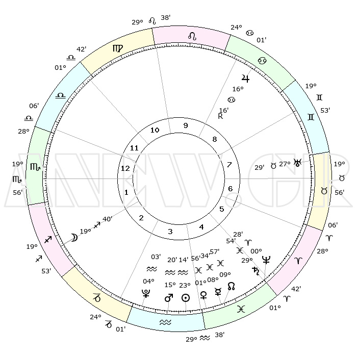 | | ΘΕΣΕΙΣ ΠΛΑΝΗΤΩΝ ΑΣΤΡΟΛΟΓΙΚΟΥ ΧΑΡΤΗ ΤΗΣ ΣΤΙΓΜΗΣ ΑΥΤΗΣ | | | | Πλανήτης | Ζώδιο | Μοίρες | Δεκαήμ. | Σε οίκο | Απόκλιση | | Ακμές των οίκων | | Ηλιος | Υδροχόος | 23°10' | Τρίτο | 4 | 13 S 47 | | 1ος | 01°14' | Σκορπιός | | Σελήνη | Τοξότης | 18°54' | Δεύτερο | 2 | 28 S 08 | | 2ος | 29°43' | Σκορπιός | | Ερμής | Ιχθείς | 08°27' | Πρώτο | 4 | 08 S 56 | | 3ος | 01°46' | Αιγόκερως | | Αφροδίτη | Ιχθείς | 01°51' | Πρώτο | 4 | 12 S 11 | | 4ος | 06°03' | Υδροχόος | | Αρης | Υδροχόος | 15°17' | Δεύτερο | 4 | 17 S 16 | | 5ος | 08°57' | Ιχθείς | | Δίας | Καρκίνος | 16°17'R | Δεύτερο | 9 | 22 N 46 | | 6ος | 07°30' | Κριός | | Κρόνος | Ιχθείς | 29°53' | Τρίτο | 5 | 02 S 01 | | 7ος | 01°14' | Ταύρος | | Ουρανός | Ταύρος | 27°29' | Τρίτο | 7 | 19 N 25 | | 8ος | 29°43' | Ταύρος | | Ποσειδώνας | Κριός | 00°28' | Πρώτο | 5 | 01 S 01 | | 9ος | 01°46' | Καρκίνος | | Πλούτωνας | Υδροχόος | 04°02' | Πρώτο | 3 | 22 S 58 | | 10ος | 06°03' | Λέων | | Β. Δεσμός | Ιχθείς | 09°57' | Πρώτο | 5 | 07 S 50 | | 11ος | 08°57' | Παρθένος | | Ωροσκόπος | Σκορπιός | 01°14' | Πρώτο | | | 12ος | 07°30' | Ζυγός | | Μεσουράνημα | Λέων | 06°03' | Πρώτο | | | |