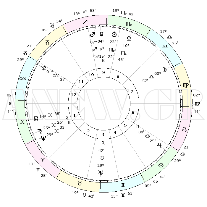 | | ΘΕΣΕΙΣ ΠΛΑΝΗΤΩΝ ΑΣΤΡΟΛΟΓΙΚΟΥ ΧΑΡΤΗ ΤΗΣ ΣΤΙΓΜΗΣ ΑΥΤΗΣ | | | | Πλανήτης | Ζώδιο | Μοίρες | Δεκαήμ. | Σε οίκο | Απόκλιση | | Ακμές των οίκων | | Ηλιος | Σκορπιός | 23°17' | Τρίτο | 10 | 18 S 35 | | 1ος | 26°05' | Αιγόκερως | | Σελήνη | Ζυγός | 00°01' | Πρώτο | 8 | 01 S 08 | | 2ος | 09°29' | Ιχθείς | | Ερμής | Τοξότης | 04°19'R | Πρώτο | 10 | 22 S 05 | | 3ος | 18°30' | Κριός | | Αφροδίτη | Σκορπιός | 10°37' | Δεύτερο | 9 | 13 S 52 | | 4ος | 17°40' | Ταύρος | | Αρης | Τοξότης | 07°51' | Πρώτο | 10 | 22 S 08 | | 5ος | 10°44' | Δίδυμοι | | Δίας | Καρκίνος | 25°08'R | Τρίτο | 6 | 21 N 13 | | 6ος | 02°02' | Καρκίνος | | Κρόνος | Ιχθείς | 25°26'R | Τρίτο | 2 | 04 S 02 | | 7ος | 26°05' | Καρκίνος | | Ουρανός | Ταύρος | 29°42'R | Τρίτο | 4 | 19 N 53 | | 8ος | 09°29' | Παρθένος | | Ποσειδώνας | Ιχθείς | 29°33'R | Τρίτο | 2 | 01 S 26 | | 9ος | 18°30' | Ζυγός | | Πλούτωνας | Υδροχόος | 01°37' | Πρώτο | 1 | 23 S 28 | | 10ος | 17°40' | Σκορπιός | | Β. Δεσμός | Ιχθείς | 14°38' | Δεύτερο | 2 | 06 S 03 | | 11ος | 10°44' | Τοξότης | | Ωροσκόπος | Αιγόκερως | 26°05' | Τρίτο | | | 12ος | 02°02' | Αιγόκερως | | Μεσουράνημα | Σκορπιός | 17°40' | Δεύτερο | | | |