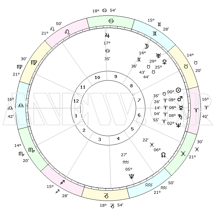 | | ΘΕΣΕΙΣ ΠΛΑΝΗΤΩΝ ΑΣΤΡΟΛΟΓΙΚΟΥ ΧΑΡΤΗ ΤΗΣ ΣΤΙΓΜΗΣ ΑΥΤΗΣ | | | | Πλανήτης | Ζώδιο | Μοίρες | Δεκαήμ. | Σε οίκο | Απόκλιση | | Ακμές των οίκων | | Ηλιος | Ταύρος | 00°32' | Πρώτο | 8 | 11 N 39 | | 1ος | 29°06' | Παρθένος | | Σελήνη | Δίδυμοι | 13°43' | Δεύτερο | 9 | 27 N 28 | | 2ος | 25°37' | Ζυγός | | Ερμής | Κριός | 08°08' | Πρώτο | 7 | 00 N 50 | | 3ος | 26°01' | Σκορπιός | | Αφροδίτη | Ταύρος | 25°40' | Τρίτο | 8 | 19 N 35 | | 4ος | 28°59' | Τοξότης | | Αρης | Κριός | 08°23' | Πρώτο | 7 | 02 N 27 | | 5ος | 01°59' | Υδροχόος | | Δίας | Καρκίνος | 17°35' | Δεύτερο | 10 | 22 N 39 | | 6ος | 02°27' | Ιχθείς | | Κρόνος | Κριός | 08°03' | Πρώτο | 7 | 01 N 13 | | 7ος | 29°06' | Ιχθείς | | Ουρανός | Ταύρος | 29°43' | Τρίτο | 9 | 19 N 55 | | 8ος | 25°37' | Κριός | | Ποσειδώνας | Κριός | 02°55' | Πρώτο | 7 | 00 S 03 | | 9ος | 26°01' | Ταύρος | | Πλούτωνας | Υδροχόος | 05°27' | Πρώτο | 5 | 22 S 48 | | 10ος | 28°59' | Δίδυμοι | | Β. Δεσμός | Ιχθείς | 06°22' | Πρώτο | 6 | 09 S 10 | | 11ος | 01°59' | Λέων | | Ωροσκόπος | Παρθένος | 29°06' | Τρίτο | | | 12ος | 02°27' | Παρθένος | | Μεσουράνημα | Δίδυμοι | 28°59' | Τρίτο | | | |