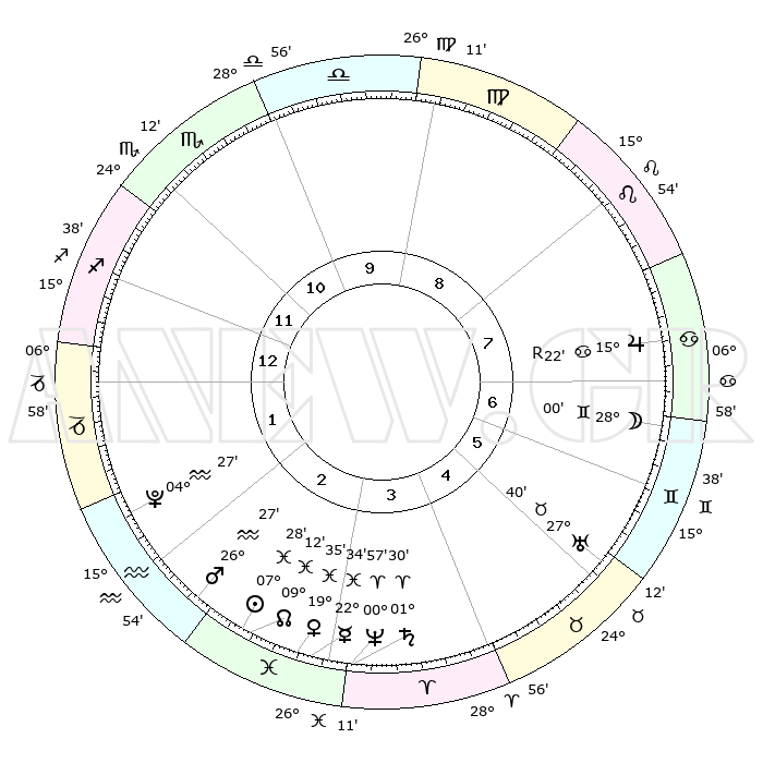 | | ΘΕΣΕΙΣ ΠΛΑΝΗΤΩΝ ΑΣΤΡΟΛΟΓΙΚΟΥ ΧΑΡΤΗ ΤΗΣ ΣΤΙΓΜΗΣ ΑΥΤΗΣ | | | | Πλανήτης | Ζώδιο | Μοίρες | Δεκαήμ. | Σε οίκο | Απόκλιση | | Ακμές των οίκων | | Ηλιος | Ιχθείς | 07°24' | Πρώτο | 3 | 08 S 47 | | 1ος | 14°31' | Τοξότης | | Σελήνη | Δίδυμοι | 27°01' | Τρίτο | 7 | 28 N 25 | | 2ος | 18°06' | Αιγόκερως | | Ερμής | Ιχθείς | 22°33' | Τρίτο | 3 | 00 S 27 | | 3ος | 26°14' | Υδροχόος | | Αφροδίτη | Ιχθείς | 19°29' | Δεύτερο | 3 | 05 S 27 | | 4ος | 01°59' | Κριός | | Αρης | Υδροχόος | 26°24' | Τρίτο | 3 | 13 S 45 | | 5ος | 00°52' | Ταύρος | | Δίας | Καρκίνος | 15°22'R | Δεύτερο | 7 | 22 N 53 | | 6ος | 24°05' | Ταύρος | | Κρόνος | Κριός | 01°29' | Πρώτο | 3 | 01 S 22 | | 7ος | 14°31' | Δίδυμοι | | Ουρανός | Ταύρος | 27°40' | Τρίτο | 6 | 19 N 28 | | 8ος | 18°06' | Καρκίνος | | Ποσειδώνας | Κριός | 00°57' | Πρώτο | 3 | 00 S 50 | | 9ος | 26°14' | Λέων | | Πλούτωνας | Υδροχόος | 04°27' | Πρώτο | 2 | 22 S 53 | | 10ος | 01°59' | Ζυγός | | Β. Δεσμός | Ιχθείς | 09°12' | Πρώτο | 3 | 08 S 07 | | 11ος | 00°52' | Σκορπιός | | Ωροσκόπος | Τοξότης | 14°31' | Δεύτερο | | | 12ος | 24°05' | Σκορπιός | | Μεσουράνημα | Ζυγός | 01°59' | Πρώτο | | | |