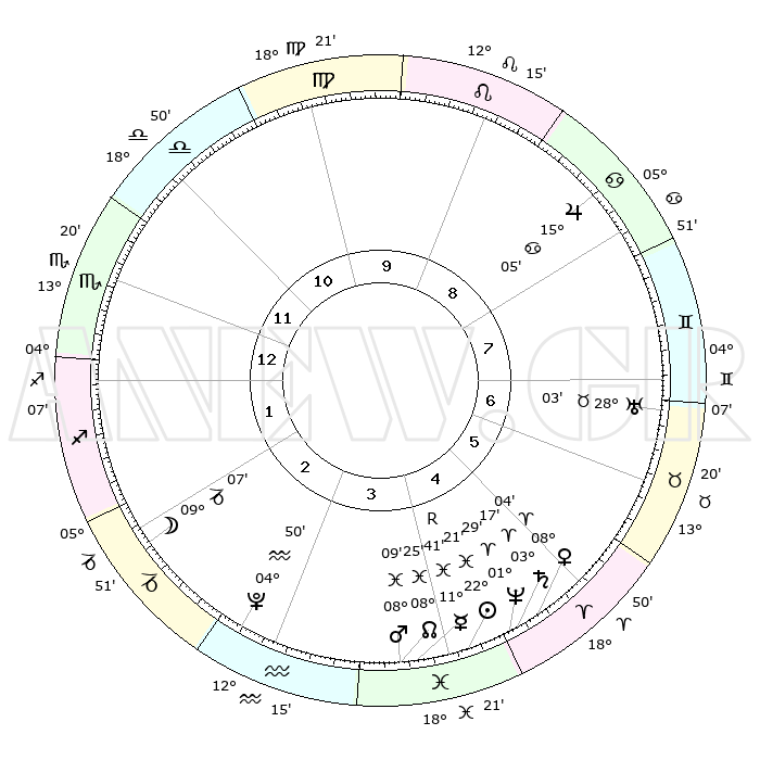 | | ΘΕΣΕΙΣ ΠΛΑΝΗΤΩΝ ΑΣΤΡΟΛΟΓΙΚΟΥ ΧΑΡΤΗ ΤΗΣ ΣΤΙΓΜΗΣ ΑΥΤΗΣ | | | | Πλανήτης | Ζώδιο | Μοίρες | Δεκαήμ. | Σε οίκο | Απόκλιση | | Ακμές των οίκων | | Ηλιος | Ιχθείς | 22°18' | Τρίτο | 4 | 03 S 03 | | 1ος | 19°57' | Σκορπιός | | Σελήνη | Αιγόκερως | 08°32' | Πρώτο | 2 | 27 S 44 | | 2ος | 19°53' | Τοξότης | | Ερμής | Ιχθείς | 11°44'R | Δεύτερο | 4 | 04 S 30 | | 3ος | 24°02' | Αιγόκερως | | Αφροδίτη | Κριός | 08°00' | Πρώτο | 5 | 02 N 10 | | 4ος | 29°38' | Υδροχόος | | Αρης | Ιχθείς | 08°07' | Πρώτο | 4 | 09 S 32 | | 5ος | 01°42' | Κριός | | Δίας | Καρκίνος | 15°05' | Δεύτερο | 8 | 22 N 56 | | 6ος | 28°07' | Κριός | | Κρόνος | Κριός | 03°17' | Πρώτο | 5 | 00 S 39 | | 7ος | 19°57' | Ταύρος | | Ουρανός | Ταύρος | 28°03' | Τρίτο | 7 | 19 N 33 | | 8ος | 19°53' | Δίδυμοι | | Ποσειδώνας | Κριός | 01°29' | Πρώτο | 4 | 00 S 36 | | 9ος | 24°02' | Καρκίνος | | Πλούτωνας | Υδροχόος | 04°50' | Πρώτο | 3 | 22 S 50 | | 10ος | 29°38' | Λέων | | Β. Δεσμός | Ιχθείς | 08°25' | Πρώτο | 4 | 08 S 25 | | 11ος | 01°42' | Ζυγός | | Ωροσκόπος | Σκορπιός | 19°57' | Δεύτερο | | | 12ος | 28°07' | Ζυγός | | Μεσουράνημα | Λέων | 29°38' | Τρίτο | | | |