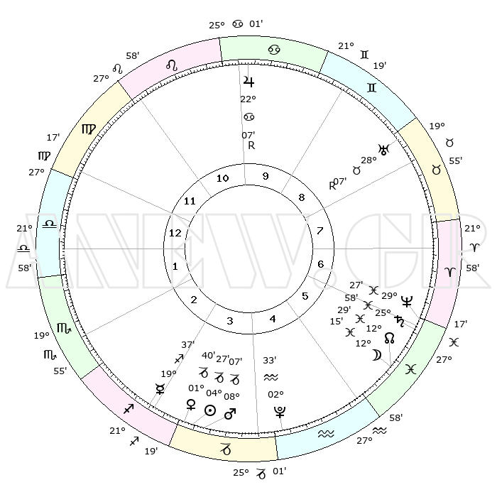 | | ΘΕΣΕΙΣ ΠΛΑΝΗΤΩΝ ΑΣΤΡΟΛΟΓΙΚΟΥ ΧΑΡΤΗ ΤΗΣ ΣΤΙΓΜΗΣ ΑΥΤΗΣ | | | | Πλανήτης | Ζώδιο | Μοίρες | Δεκαήμ. | Σε οίκο | Απόκλιση | | Ακμές των οίκων | | Ηλιος | Αιγόκερως | 04°22' | Πρώτο | 4 | 23 S 22 | | 1ος | 27°39' | Παρθένος | | Σελήνη | Ιχθείς | 11°11' | Δεύτερο | 6 | 07 S 23 | | 2ος | 24°04' | Ζυγός | | Ερμής | Τοξότης | 19°30' | Δεύτερο | 3 | 22 S 52 | | 3ος | 24°24' | Σκορπιός | | Αφροδίτη | Αιγόκερως | 01°34' | Πρώτο | 4 | 23 S 42 | | 4ος | 27°22' | Τοξότης | | Αρης | Αιγόκερως | 08°03' | Πρώτο | 4 | 24 S 02 | | 5ος | 00°22' | Υδροχόος | | Δίας | Καρκίνος | 22°08'R | Τρίτο | 10 | 21 N 50 | | 6ος | 00°54' | Ιχθείς | | Κρόνος | Ιχθείς | 25°58' | Τρίτο | 6 | 03 S 42 | | 7ος | 27°39' | Ιχθείς | | Ουρανός | Ταύρος | 28°07'R | Τρίτο | 9 | 19 N 33 | | 8ος | 24°04' | Κριός | | Ποσειδώνας | Ιχθείς | 29°27' | Τρίτο | 7 | 01 S 27 | | 9ος | 24°24' | Ταύρος | | Πλούτωνας | Υδροχόος | 02°33' | Πρώτο | 5 | 23 S 15 | | 10ος | 27°22' | Δίδυμοι | | Β. Δεσμός | Ιχθείς | 12°30' | Δεύτερο | 6 | 06 S 52 | | 11ος | 00°22' | Λέων | | Ωροσκόπος | Παρθένος | 27°39' | Τρίτο | | | 12ος | 00°54' | Παρθένος | | Μεσουράνημα | Δίδυμοι | 27°22' | Τρίτο | | | |