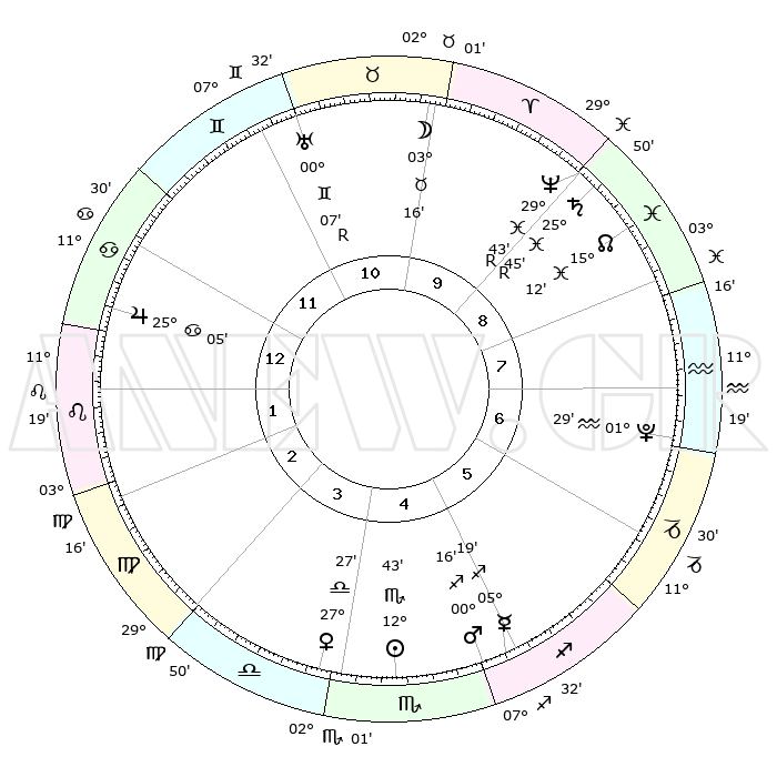 | | ΘΕΣΕΙΣ ΠΛΑΝΗΤΩΝ ΑΣΤΡΟΛΟΓΙΚΟΥ ΧΑΡΤΗ ΤΗΣ ΣΤΙΓΜΗΣ ΑΥΤΗΣ | | | | Πλανήτης | Ζώδιο | Μοίρες | Δεκαήμ. | Σε οίκο | Απόκλιση | | Ακμές των οίκων | | Ηλιος | Σκορπιός | 12°36' | Δεύτερο | 5 | 15 S 37 | | 1ος | 04°42' | Καρκίνος | | Σελήνη | Ταύρος | 01°24' | Πρώτο | 11 | 15 N 18 | | 2ος | 25°16' | Καρκίνος | | Ερμής | Τοξότης | 05°15' | Πρώτο | 6 | 23 S 57 | | 3ος | 17°25' | Λέων | | Αφροδίτη | Ζυγός | 27°18' | Τρίτο | 5 | 09 S 11 | | 4ος | 14°29' | Παρθένος | | Αρης | Τοξότης | 00°11' | Πρώτο | 6 | 20 S 36 | | 5ος | 19°08' | Ζυγός | | Δίας | Καρκίνος | 25°04' | Τρίτο | 1 | 21 N 12 | | 6ος | 28°43' | Σκορπιός | | Κρόνος | Ιχθείς | 25°46'R | Τρίτο | 10 | 03 S 56 | | 7ος | 04°42' | Αιγόκερως | | Ουρανός | Δίδυμοι | 00°08'R | Πρώτο | 12 | 19 N 58 | | 8ος | 25°16' | Αιγόκερως | | Ποσειδώνας | Ιχθείς | 29°43'R | Τρίτο | 10 | 01 S 22 | | 9ος | 17°25' | Υδροχόος | | Πλούτωνας | Υδροχόος | 01°29' | Πρώτο | 8 | 23 S 30 | | 10ος | 14°29' | Ιχθείς | | Β. Δεσμός | Ιχθείς | 15°12' | Δεύτερο | 10 | 05 S 50 | | 11ος | 19°08' | Κριός | | Ωροσκόπος | Καρκίνος | 04°42' | Πρώτο | | | 12ος | 28°43' | Ταύρος | | Μεσουράνημα | Ιχθείς | 14°29' | Δεύτερο | | | |