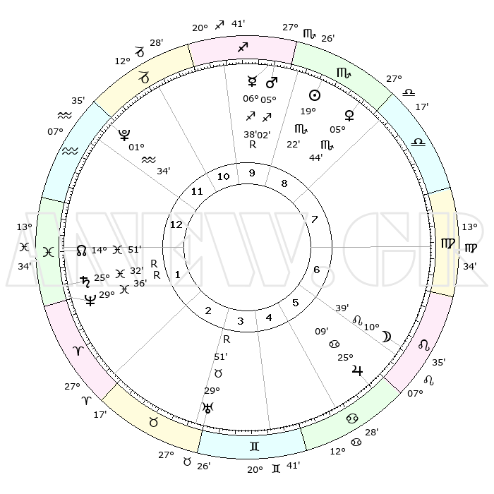 | | ΘΕΣΕΙΣ ΠΛΑΝΗΤΩΝ ΑΣΤΡΟΛΟΓΙΚΟΥ ΧΑΡΤΗ ΤΗΣ ΣΤΙΓΜΗΣ ΑΥΤΗΣ | | | | Πλανήτης | Ζώδιο | Μοίρες | Δεκαήμ. | Σε οίκο | Απόκλιση | | Ακμές των οίκων | | Ηλιος | Σκορπιός | 19°18' | Δεύτερο | 9 | 17 S 33 | | 1ος | 06°00' | Υδροχόος | | Σελήνη | Λέων | 09°41' | Πρώτο | 7 | 20 N 44 | | 2ος | 20°58' | Ιχθείς | | Ερμής | Τοξότης | 06°39'R | Πρώτο | 10 | 23 S 27 | | 3ος | 28°24' | Κριός | | Αφροδίτη | Σκορπιός | 05°39' | Πρώτο | 9 | 12 S 11 | | 4ος | 25°52' | Ταύρος | | Αρης | Τοξότης | 04°59' | Πρώτο | 10 | 21 S 36 | | 5ος | 18°14' | Δίδυμοι | | Δίας | Καρκίνος | 25°09' | Τρίτο | 6 | 21 N 12 | | 6ος | 09°55' | Καρκίνος | | Κρόνος | Ιχθείς | 25°32'R | Τρίτο | 2 | 04 S 01 | | 7ος | 06°00' | Λέων | | Ουρανός | Ταύρος | 29°51'R | Τρίτο | 4 | 19 N 55 | | 8ος | 20°58' | Παρθένος | | Ποσειδώνας | Ιχθείς | 29°36'R | Τρίτο | 2 | 01 S 25 | | 9ος | 28°24' | Ζυγός | | Πλούτωνας | Υδροχόος | 01°34' | Πρώτο | 12 | 23 S 29 | | 10ος | 25°52' | Σκορπιός | | Β. Δεσμός | Ιχθείς | 14°51' | Δεύτερο | 1 | 05 S 58 | | 11ος | 18°14' | Τοξότης | | Ωροσκόπος | Υδροχόος | 06°00' | Πρώτο | | | 12ος | 09°55' | Αιγόκερως | | Μεσουράνημα | Σκορπιός | 25°52' | Τρίτο | | | |