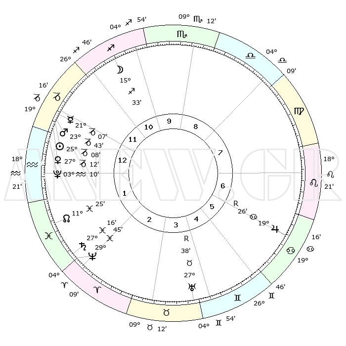 | | ΘΕΣΕΙΣ ΠΛΑΝΗΤΩΝ ΑΣΤΡΟΛΟΓΙΚΟΥ ΧΑΡΤΗ ΤΗΣ ΣΤΙΓΜΗΣ ΑΥΤΗΣ | | | | Πλανήτης | Ζώδιο | Μοίρες | Δεκαήμ. | Σε οίκο | Απόκλιση | | Ακμές των οίκων | | Ηλιος | Αιγόκερως | 25°04' | Τρίτο | 1 | 21 S 07 | | 1ος | 19°56' | Αιγόκερως | | Σελήνη | Τοξότης | 14°47' | Δεύτερο | 11 | 27 S 38 | | 2ος | 02°03' | Ιχθείς | | Ερμής | Αιγόκερως | 21°01' | Τρίτο | 1 | 23 S 34 | | 3ος | 11°47' | Κριός | | Αφροδίτη | Αιγόκερως | 27°07' | Τρίτο | 1 | 21 S 42 | | 4ος | 12°05' | Ταύρος | | Αρης | Αιγόκερως | 23°40' | Τρίτο | 1 | 22 S 19 | | 5ος | 05°44' | Δίδυμοι | | Δίας | Καρκίνος | 19°27'R | Δεύτερο | 6 | 22 N 18 | | 6ος | 26°57' | Δίδυμοι | | Κρόνος | Ιχθείς | 27°16' | Τρίτο | 2 | 03 S 07 | | 7ος | 19°56' | Καρκίνος | | Ουρανός | Ταύρος | 27°38'R | Τρίτο | 4 | 19 N 26 | | 8ος | 02°03' | Παρθένος | | Ποσειδώνας | Ιχθείς | 29°44' | Τρίτο | 2 | 01 S 19 | | 9ος | 11°47' | Ζυγός | | Πλούτωνας | Υδροχόος | 03°10' | Πρώτο | 1 | 23 S 08 | | 10ος | 12°05' | Σκορπιός | | Β. Δεσμός | Ιχθείς | 11°25' | Δεύτερο | 2 | 07 S 17 | | 11ος | 05°44' | Τοξότης | | Ωροσκόπος | Αιγόκερως | 19°56' | Δεύτερο | | | 12ος | 26°57' | Τοξότης | | Μεσουράνημα | Σκορπιός | 12°05' | Δεύτερο | | | |